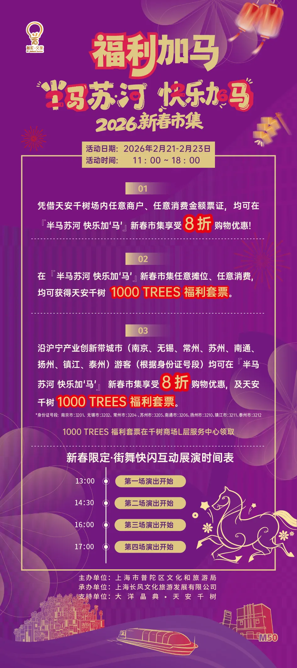 2月21日至2月23日(年初五至初七),半马苏河快乐加“马”2026新春市集温情开市!这里集结了区域内星级酒店、中大型品质酒店及特色主题酒店,更有沿沪宁产业创新带城市的非遗好物、年俗文创齐聚一堂,一站式呈现酒店招牌菜、创意特调、各地非遗等多元盛宴,让你在味觉盛宴中感受年俗暖意,在互动打卡中定格新春欢喜,解锁沉浸式新春消费新场景!