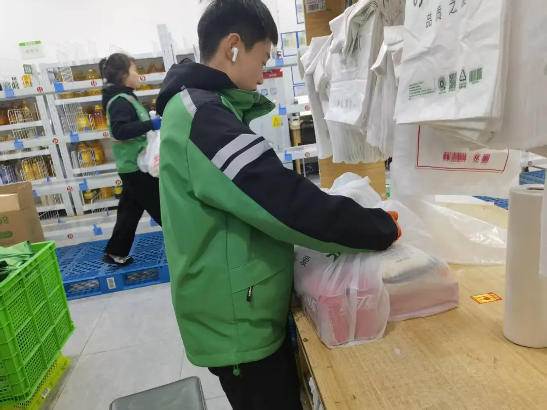 叮咚买菜杨行站位于蕰川公路1867号,店内员工40余人,为了更好地服务杨行片区用户,让邻居吃上更新鲜的菜,保证运力充足的情况下,今年春节留守30余人,除夕当日订单量达到1700多单,除夕当天,叮咚买菜杨行站店员们凌晨4点已陆续上岗做准备工作:仓管人员精挑细选看商品质量,检查鲜花、蔬菜品质与库存情况;分拣人员提前开始分拣订单,避免高峰时段订单积压,确保居民能准时吃上热腾腾的年夜饭;配送小哥6点准备开始配送订单,除夕当天下了一整天雨,小哥的衣服一整天都是湿漉漉的,但为了保质保量、安全准时地把居民的菜篮子送回家,小哥任劳任怨,坚守至除夕当天收工,他们是连接商家与家庭的纽带,是在寒风中飞驰的“骑士”。每一次准时的送达,每一次贴心的问候,都承载着对市民生活的关怀,也为这个春节增添了便捷与温情。