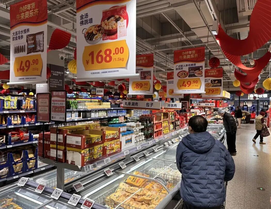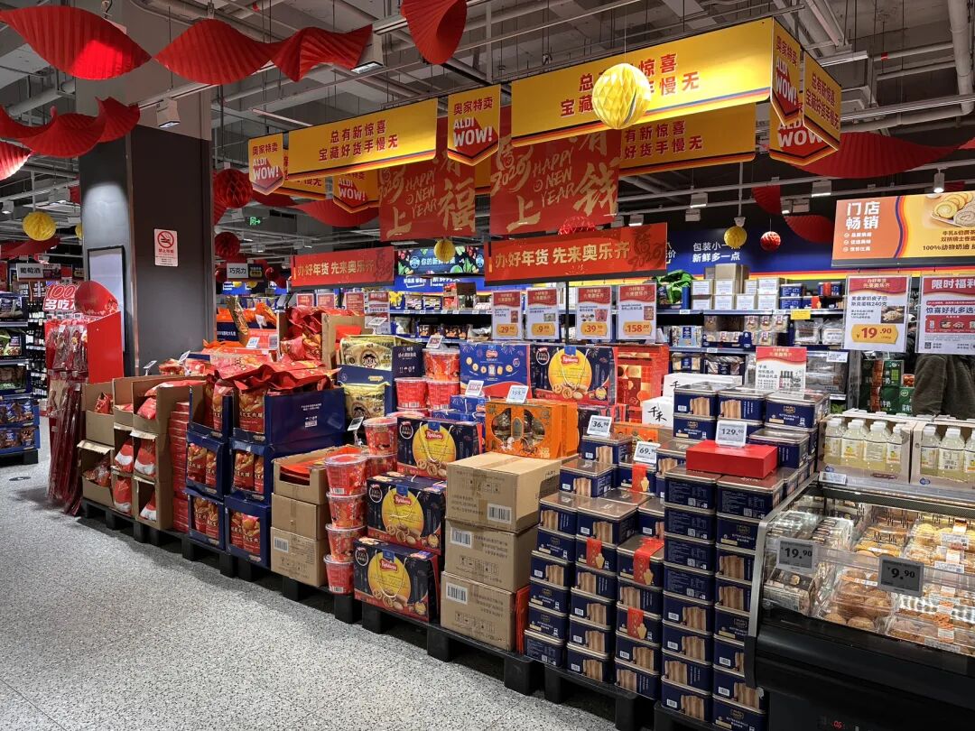 在万源路550号1楼的奥乐齐超市内,红灯笼、彩条花等装饰让年味扑面而来,连音乐都传递着新年的欢快,不少市民结伴选购节日家用、生鲜水果。