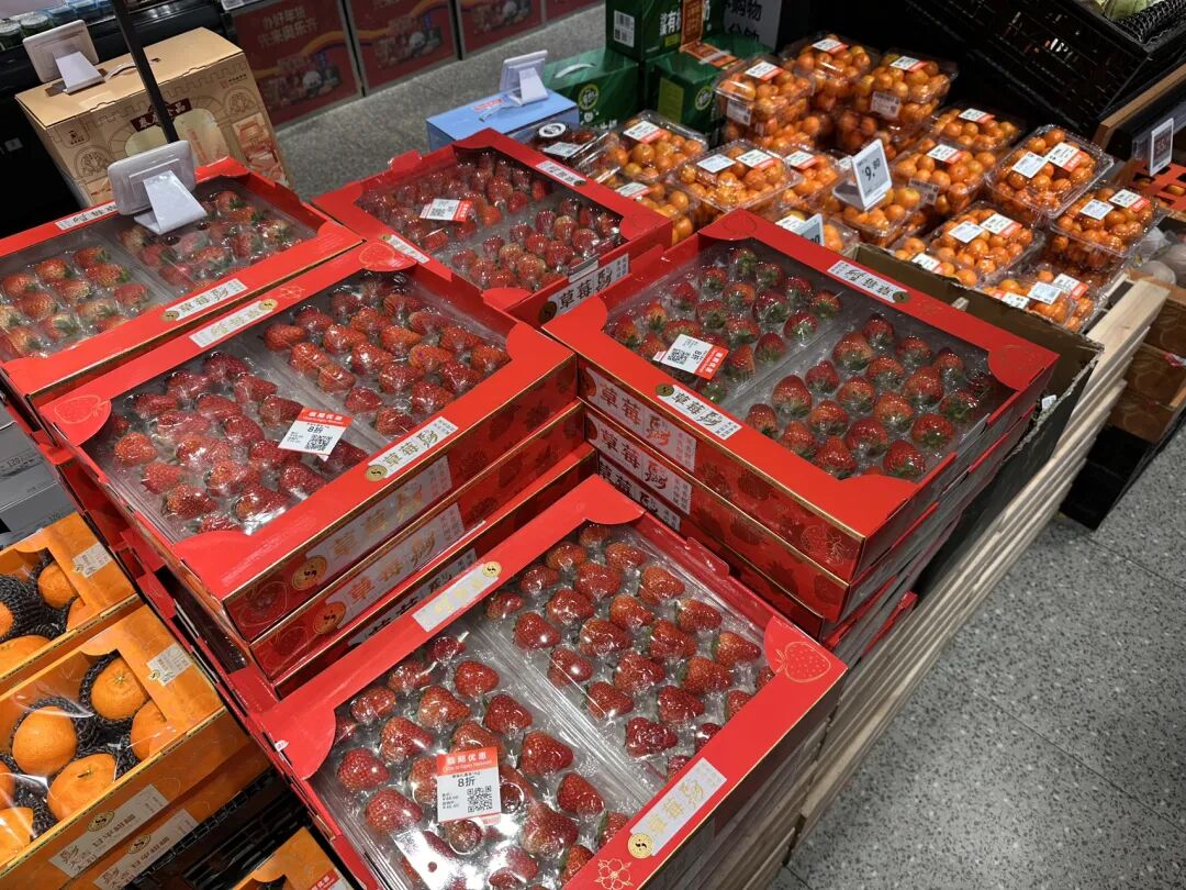金枕榴莲肉质饱满,软糯香甜;红颜草莓娇艳欲滴,形状玲珑。礼盒的包装,适合假期走亲访友。烘焙面包、鲜奶油蛋糕一个个整齐地摆放在货架上,很受欢迎,工作人员忙着补货,超市内热闹不已。