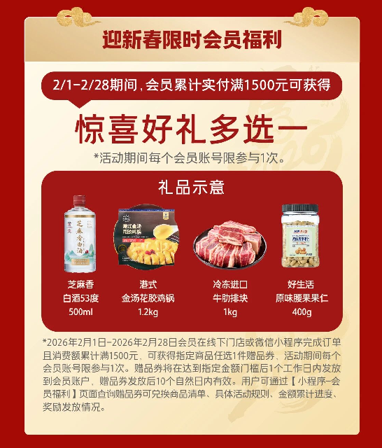此外,奥乐齐超市也为顾客们准备了新年福利:即日起至28日,会员在线下门店或微信小程序累计实付满1500元,可获得指定商品任选1件赠品券。