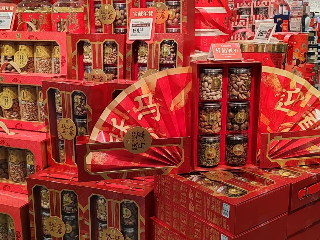 大红春联、传统福字,星宝购物中心的盒马鲜生门店一派红红火火的样子,车厘子、年宵花、坚果礼盒等各类年货摆放在显眼的位置,为市民们打造了温暖祥和的购物环境。