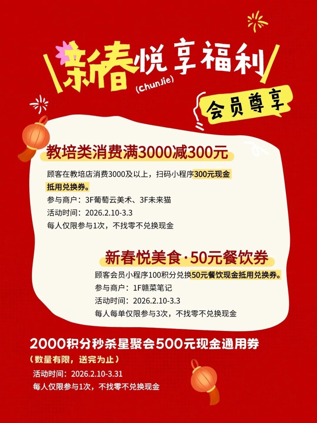 诚意满满的惠民优惠,让普陀市民的新春消费更实惠、更舒心。餐饮板块推出“新春好福气”50团100优惠,联动场内商户让市民以实惠价格畅享新春美味;教培商户推出满3000减300限时充值活动,为孩子的成长送上新春福利;会员可凭积分兑换星聚会500元抵用券,漾·Neo汤泉生活也同步推出泡汤特惠。餐饮、休闲、教培多场景优惠全覆盖,让市民游客在满满的年味儿中度过一个难忘的春节假期。