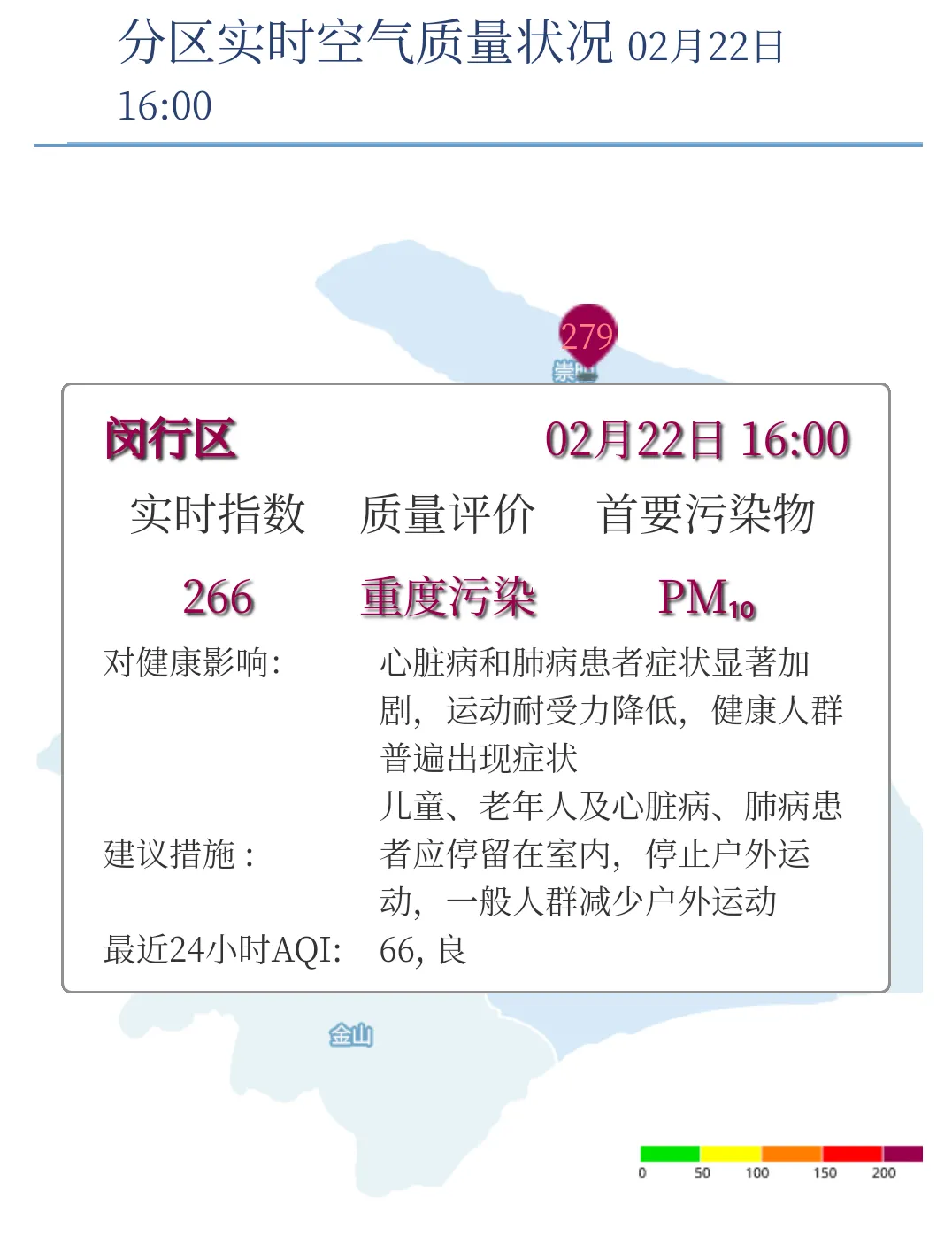 2月22日16时,闵行区AQI为266,重度污染,AQI为66,良。