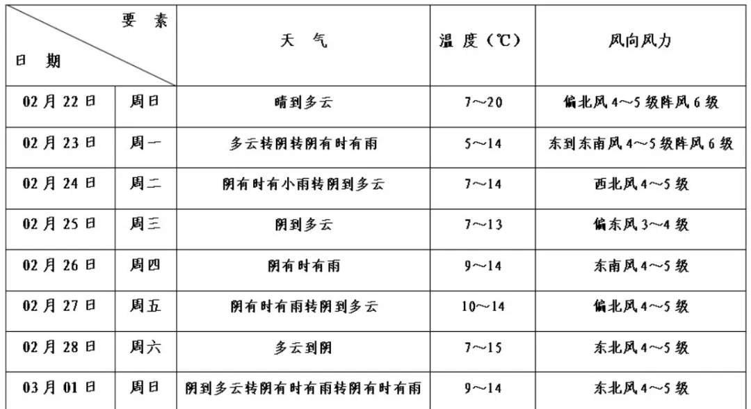 据最新气象资料分析:22日中午起受冷空气影响,风力增大,气温逐步下降。下周起本区有3次降雨过程,出现在23—24日、26—27日以及3月1—2日。