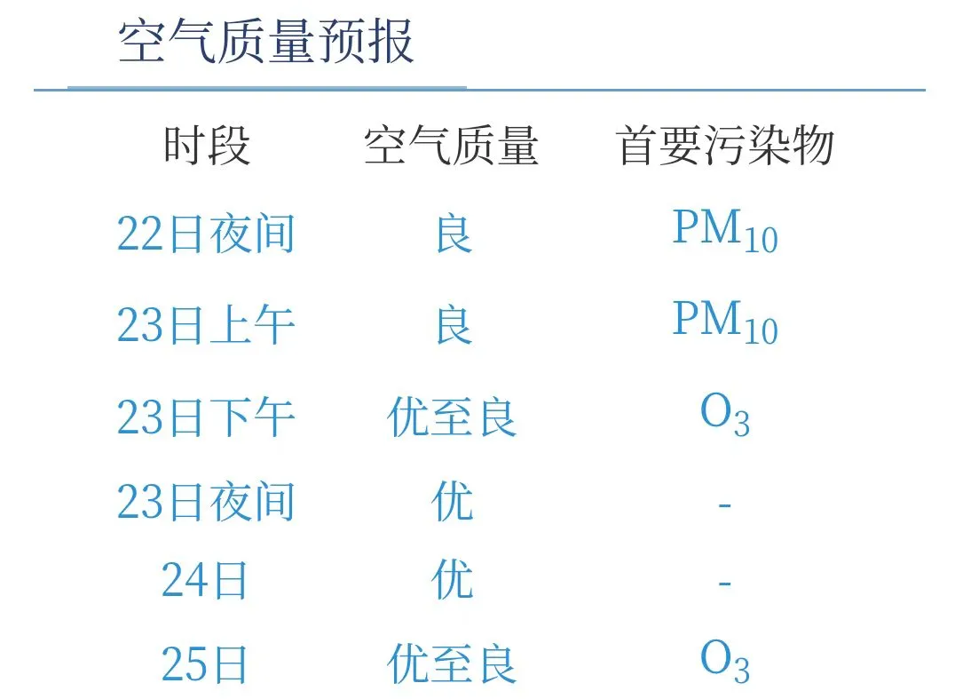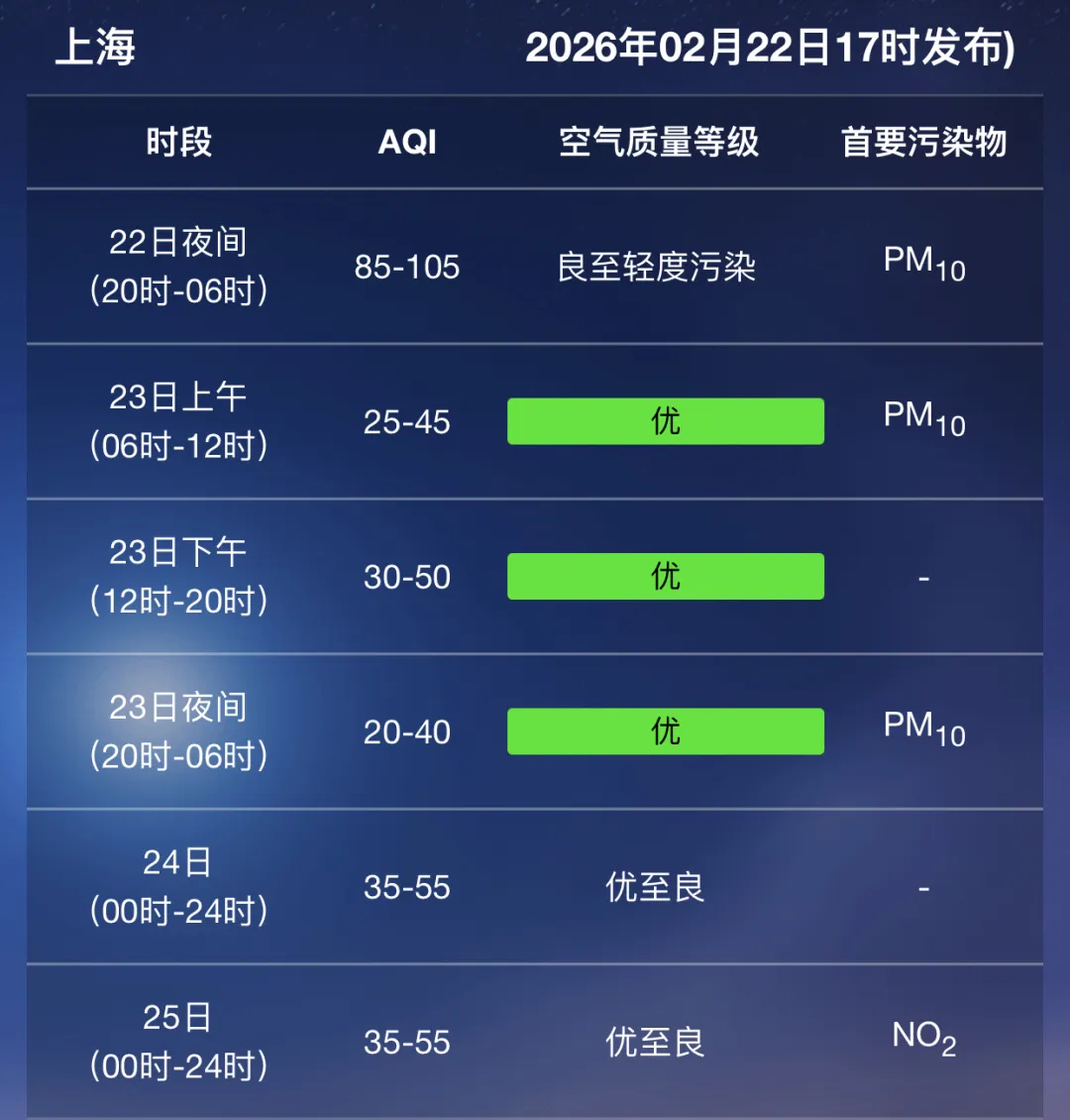 根据上海市环境监测中心预报,22日夜间到23日上午空气质量良,下午优至良,夜间到24日优。
