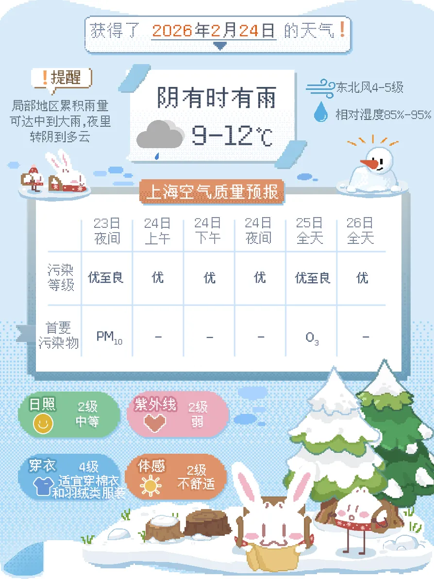 受地面低压波动影响,2月23日夜间起申城出现一次较为明显的降水过程,预计2月24日白天降水继续,阴有时有雨,夜里起雨止转阴到多云,出行注意道路交通安全。上午起东北风4~5级,相对湿度85%~95%,全天气温在9~12℃,体感湿冷,大家出门还得多穿点,谨防感冒。