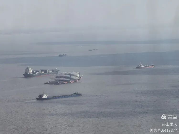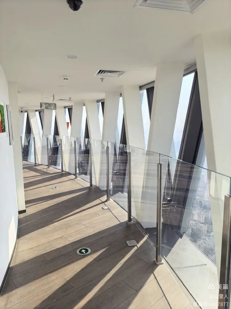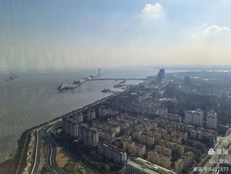 虽然阳光绽放,海滨边的冷依旧可辨。整个360°环形玻璃墙,西面相对干净透光,所以俯瞰宝山城市一角的“干净”程度稍好。
