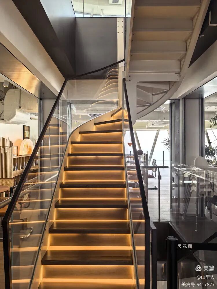金箍棒中轴内有电梯,而在定海神针店内部,空间的拓展则因地制宜。这是17楼前往18楼的内部楼梯。
