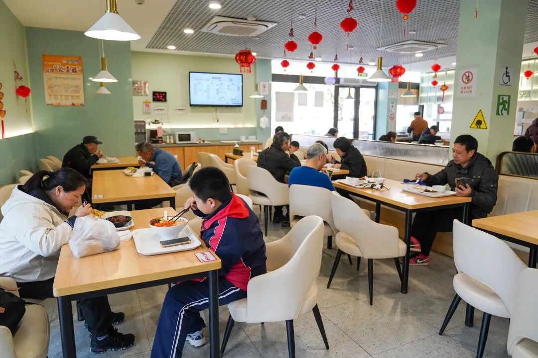 一到中午饭点,社区食堂就热闹了起来。居民们有序排队取餐,落座就餐,空气中飘着阵阵饭菜香,不时传来“这菜看着就新鲜”“我试试这个春笋”的讨论声,应季春菜格外抢手。