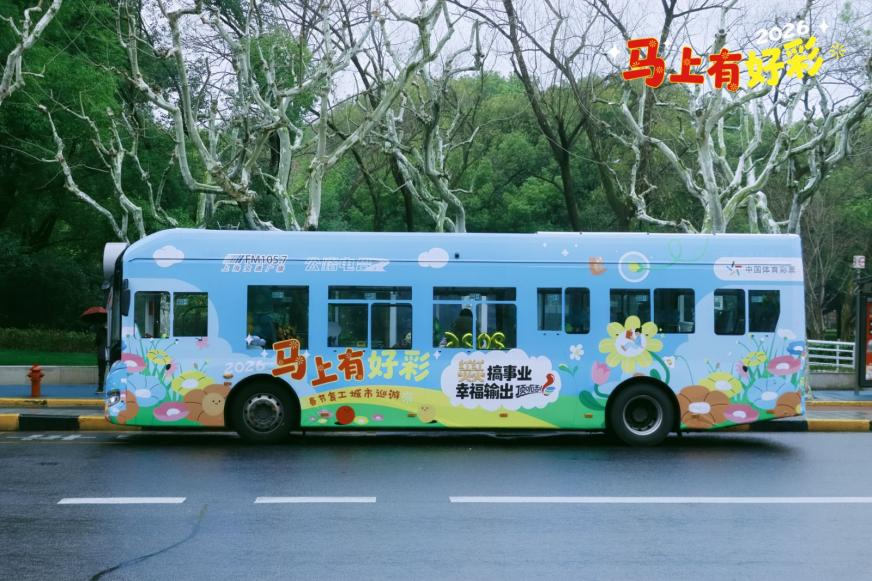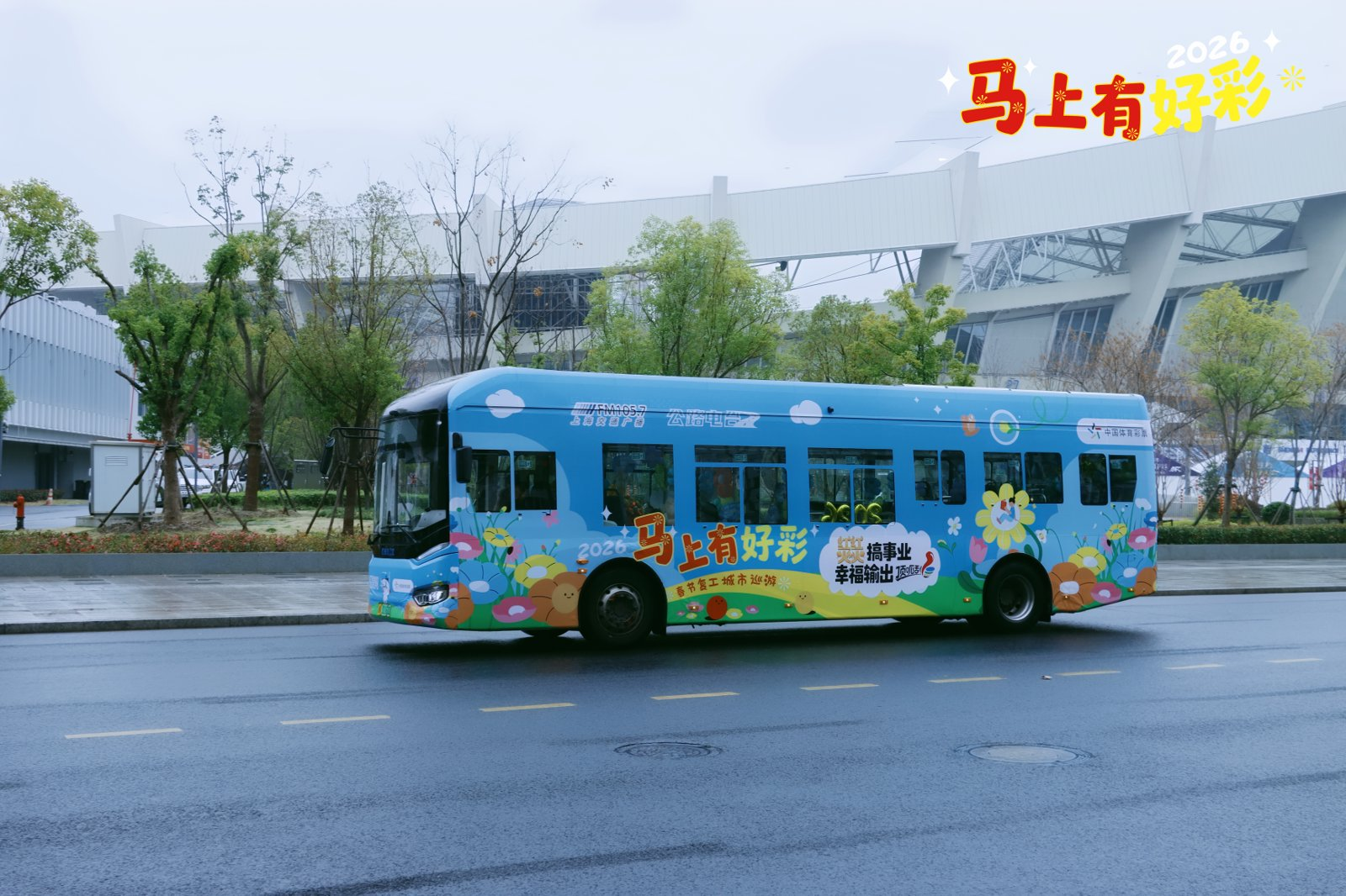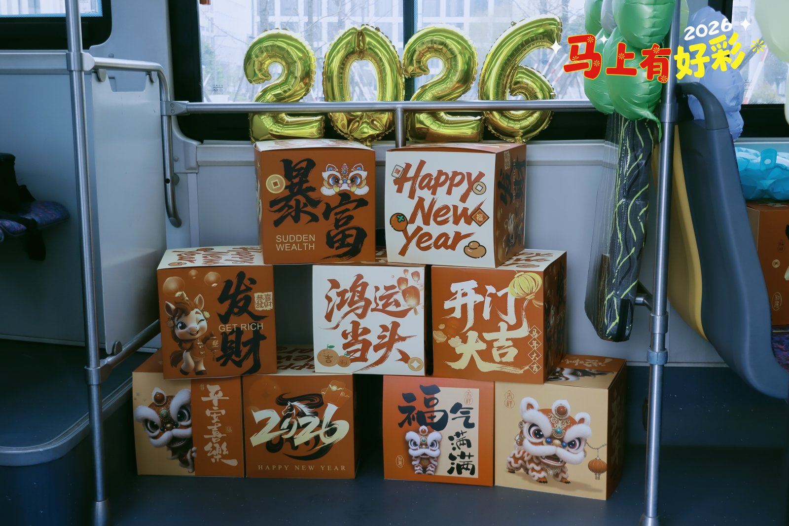 体彩专属幸运巴士身披蓝色外衣,车身点缀了体彩元素与鲜花图案,醒目且充满活力。车厢内别出心裁地营造出“新春花路”,搭配趣味盎然的手持拍照牌,每一处细节都让踏入车厢的市民感受到扑面而来的春意。
