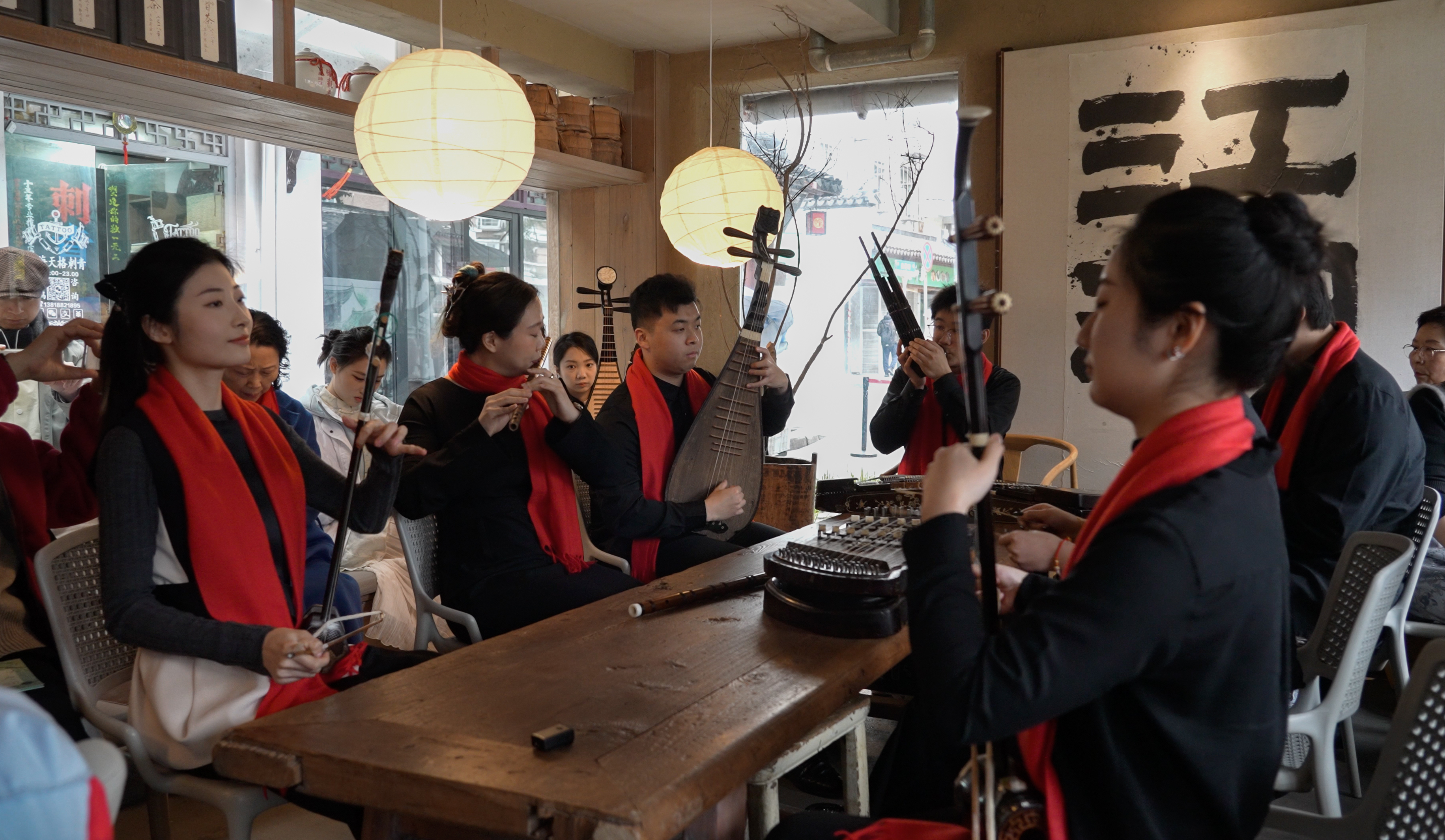 丙午赏心院内的元宵雅集,正是项目成果最生动的呈现。上海音乐学院携手上海徐汇长桥江南丝竹乐社、上海浦东新区康文国乐社、范家丝竹班沪上三家传统丝竹乐社,还有中央音乐学院“生生丝竹乐团”、上海音乐学院“樂龠组合”的师生们同台献艺,全程使用古法蚕丝弦乐器,无扩音设备,以天然共鸣奏响《欢乐歌》《行街》《花茉莉》等经典曲牌。弦音清润如泉,笛韵悠扬如云,琴音温润如玉,柔而不弱、清而不尖,与檐角细雨、塘水潺潺相映成趣。
