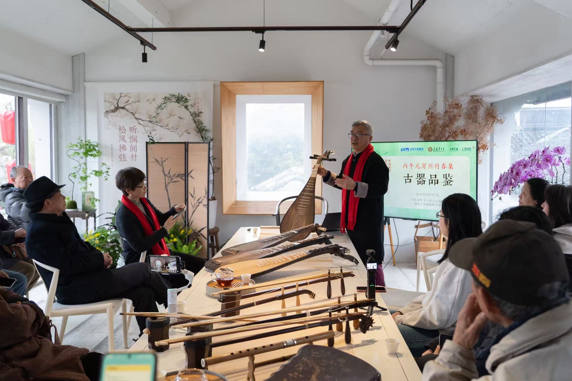 除了现场演奏,活动还特别安排了乐器品鉴环节,由上海大龢堂乐器修复、制作师沈正国与东方乐器博物馆邢媛共同主讲,现场集中展示了多件老乐器与复刻乐器,让观众近距离感受江南丝竹的“声音根脉”。