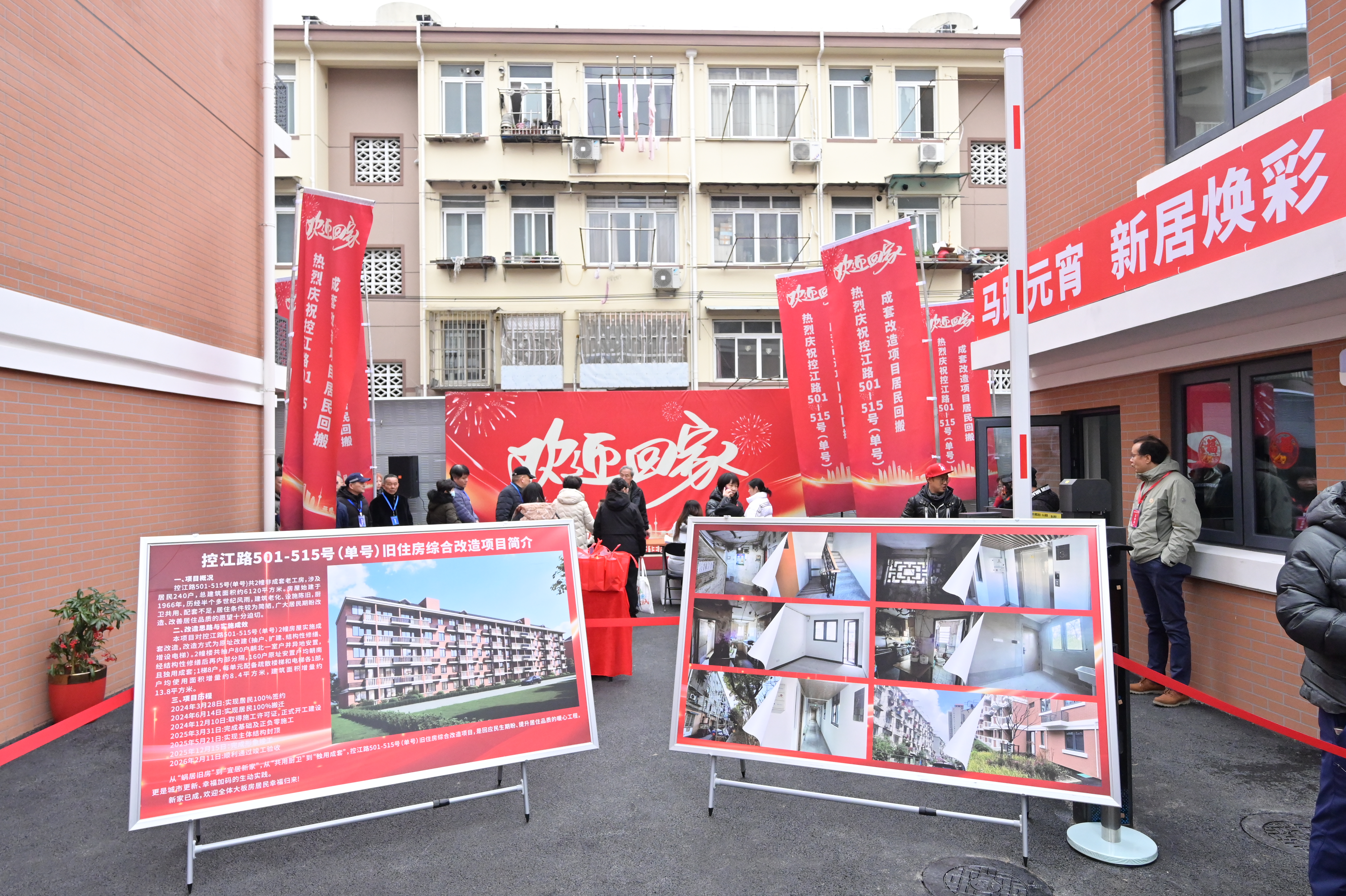 3月3日,农历正月十五,元宵佳节。上海市杨浦区控江路501-515号(单号)门口,处处洋溢着浓浓的喜庆。红灯笼高挂,敲锣打鼓,这一天,被称为“内江大板房”的旧住房成套改造项目正式交付,首批160户居民在团圆佳节里,分批“回搬”,喜提新房钥匙。