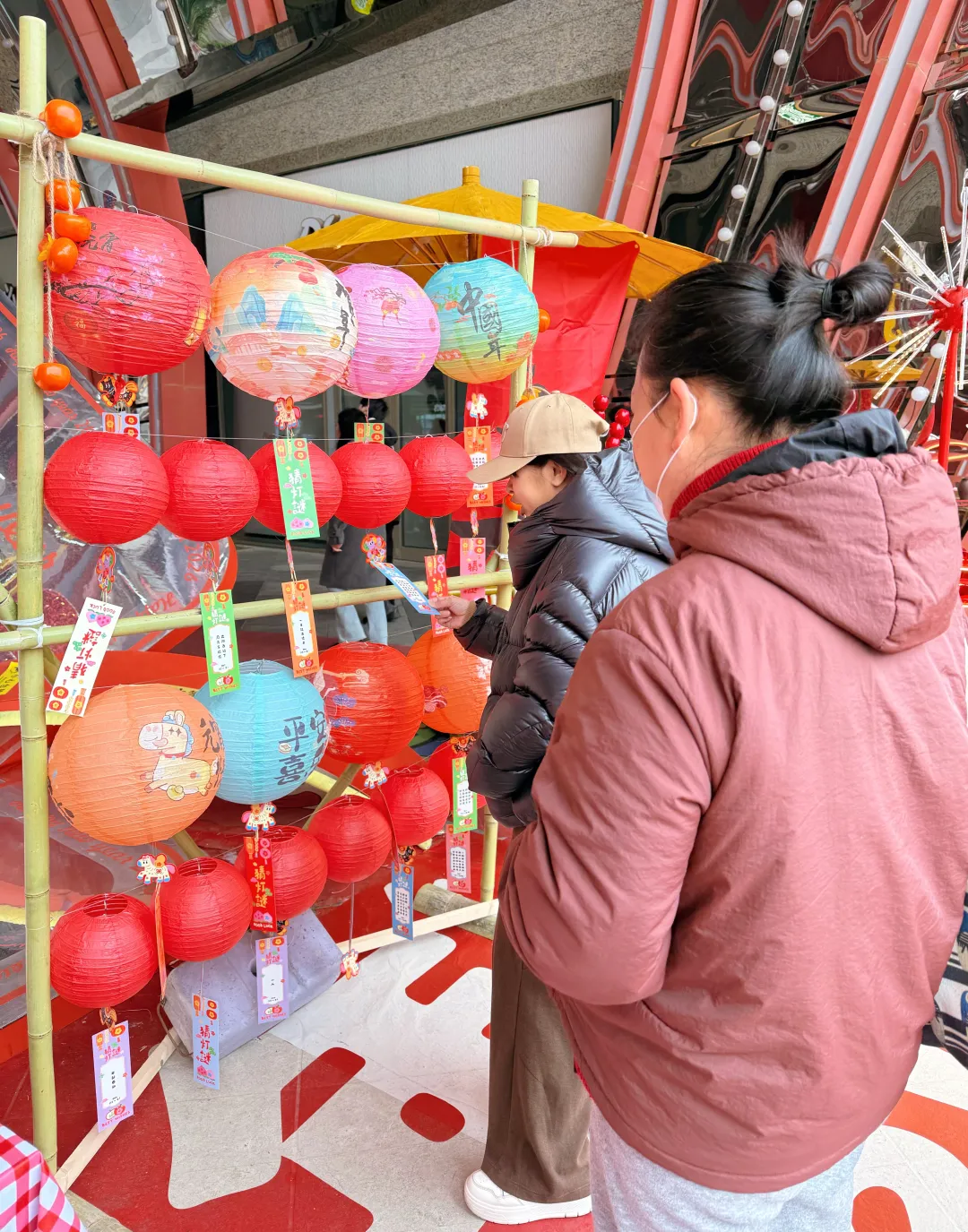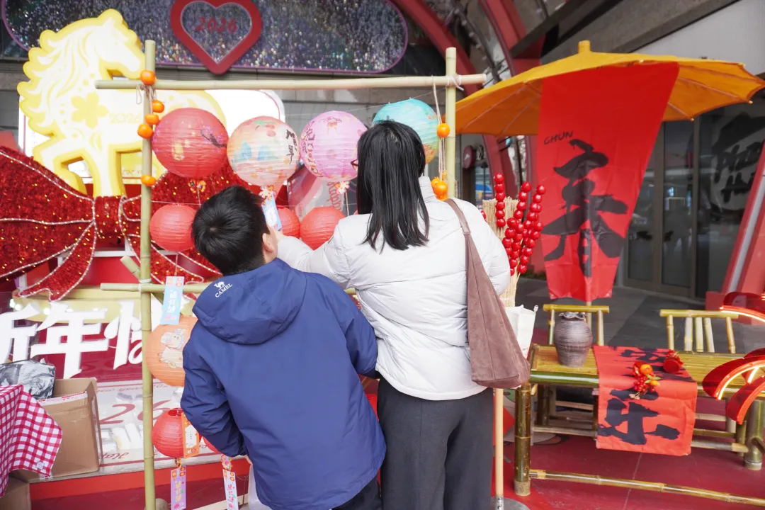 走进商场一层,公共区域被装点得格外喜庆,上万盏灯笼错落垂挂,形成“灯火满广场”的壮观景象。每盏灯笼下悬挂着兼顾传统民俗与趣味知识的灯谜,吸引市民驻足思考,孩子们在家长陪伴下争相竞猜。“树上挂、取下它、把油榨。我感觉这个答案应该是橄榄。”市民彭晶晶在灯笼下观察多时,最终取下了自己较为确定的一张灯谜,“今天一进来就感受到了浓浓的元宵氛围,一会儿我还想去体验别的区域,很有意思!”