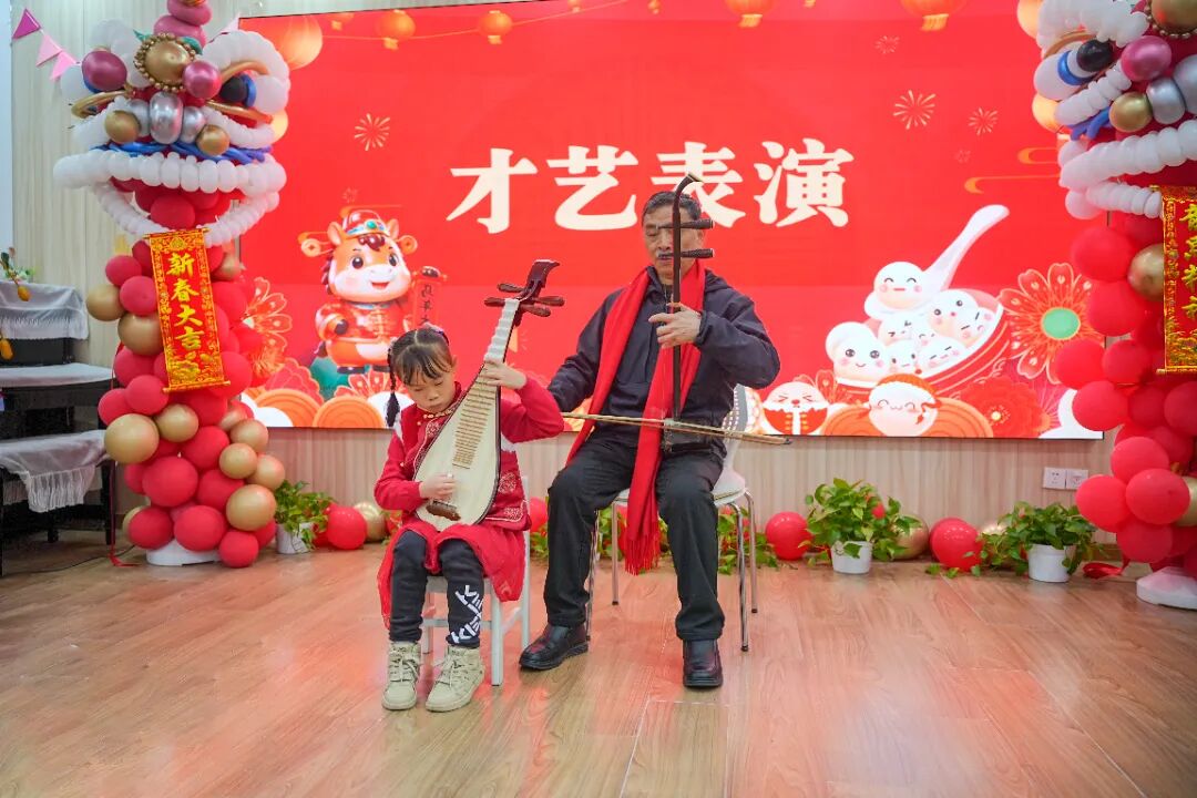 活动中,孩子们的家长也应邀到场,他们还带来了文艺节目。外婆唱响流行歌曲、外公吹奏口琴、爷爷表演书法……一位小朋友的外公演奏了二胡经典曲目《赛马》,祖孙又合奏了一曲《新年好》。果果幼儿园的老师们也表演了情景剧,与老人、孩子共度欢乐时光。