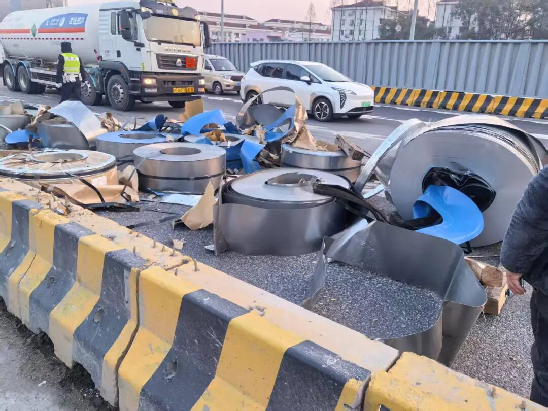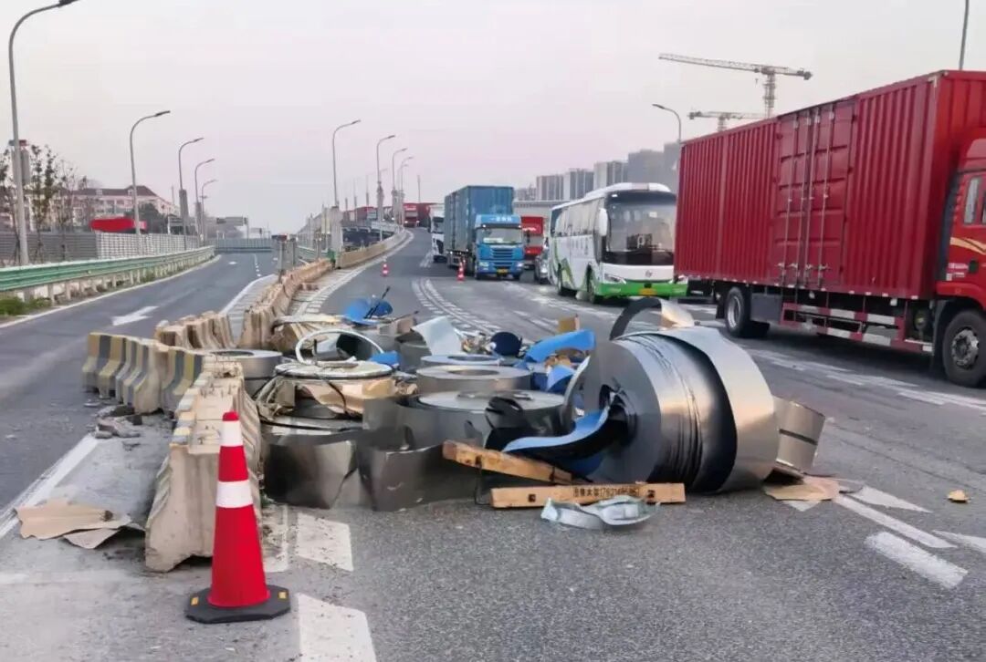 接到报警后,闵行公安分局交管支队高速大队迅速联动道路养护及清障单位赶到现场,民警第一时间设置警戒区域,引导车辆有序通行,经过紧急吊装作业,散落在路面的钢卷被安全移离,交通秩序很快恢复正常。