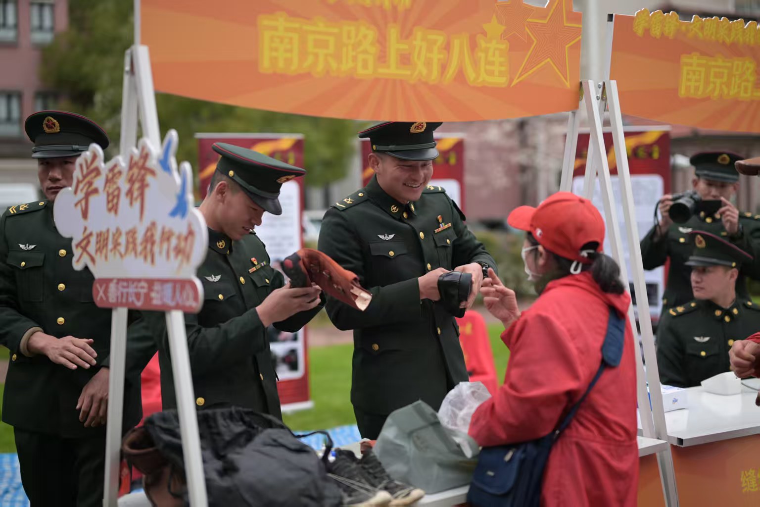 一旁的“南京路上好八连为民服务区”更是人气爆棚。好八连官兵与区域共建单位志愿者们一道,为市民提供公益理发、衣物缝补、反诈宣传、免费拍照等服务。一把剪刀、一根针线、一句叮嘱……看似寻常的小事,却饱含着人民子弟兵对群众的深情厚谊,让雷锋精神在点滴服务中熠熠生辉。