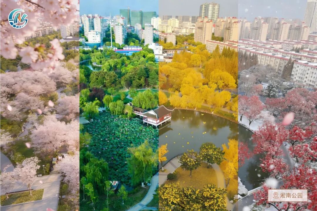 最后这张航拍图,以淞南公园的实景航拍为底,将AI生成的春夏秋冬四季名花浓缩于一帧画面。春日的粉、夏日的绿、秋日的金、冬日的白相互交织,四季流转的轨迹清晰可见,仿佛一场跨越时光的视觉盛宴。这不仅是数字创意的极致展现,更象征着淞南镇四季常新的活力与生生不息的美好。