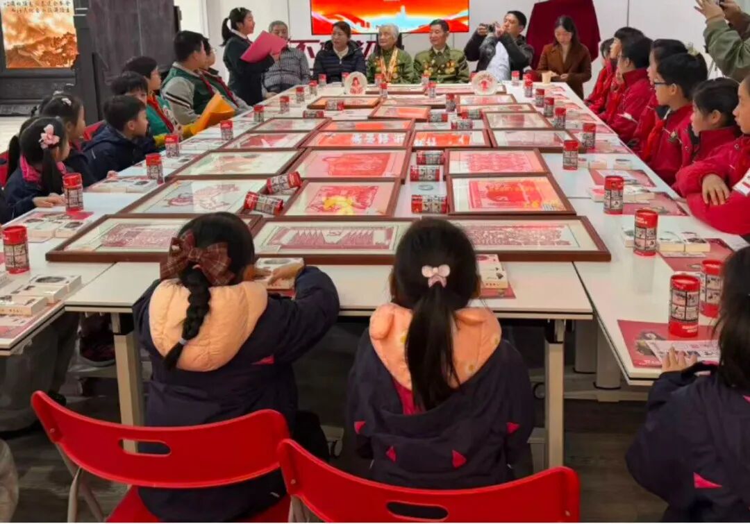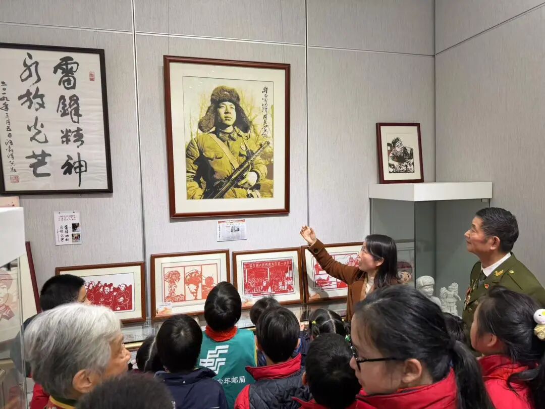 在讲解员的带领下,学生们走进新时代红色陶瓷艺术馆的“雷锋角”,开启了一场沉浸式的红色文化体验。剪纸作品《雷锋握枪》栩栩如生,吸引孩子们驻足观看;“雷锋精神永放光芒”书法作品庄重有力;雷锋书签、邮资机戳等文创产品也深受学生喜爱。