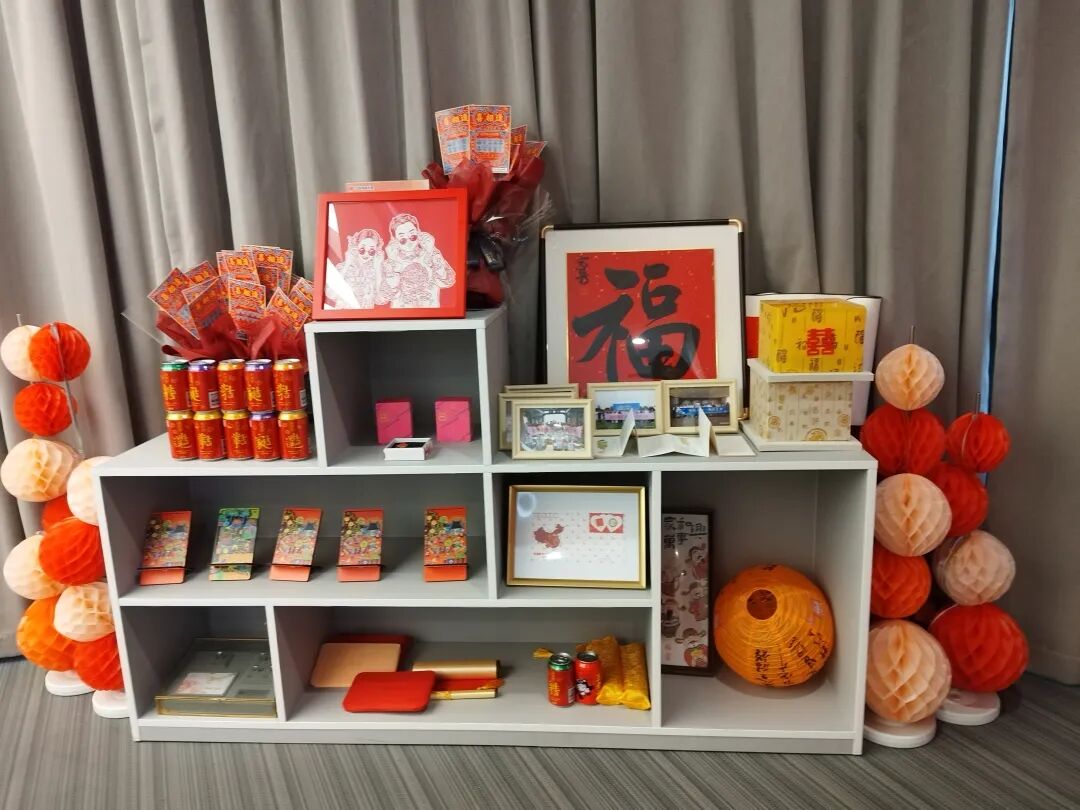步入闵行婚登中心大厅,红色的桌布、红色的装饰、红色的“囍”字,连空气中都弥漫着甜蜜的香气。登记窗口一字排开,等候区的新人们笑脸盈盈,安静而温馨。右侧的文创角也是喜气洋洋,红色调的文创产品琳琅满目,还有与福利彩票中心联名的“喜相逢”刮刮乐,每一个都是喜庆的代言。
