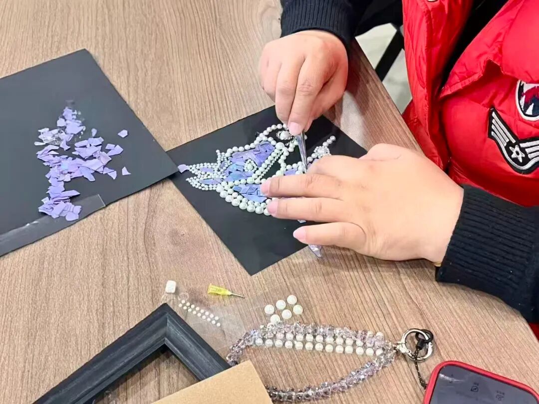 活动伊始,专业老师细致讲解螺钿工艺的悠久历史、独特魅力与深厚文化价值,从螺钿的选材、打磨到拼贴技巧,耐心拆解每一个步骤,让大家在聆听中领略传统非遗的匠心之美。随后,大家在老师的全程指导下,或精心勾勒纹样,或细致拼接色彩,在一嵌一琢、一粘一磨中,感受传统手工艺的温度与魅力,一个个精致灵动的螺钿马头逐渐成型。