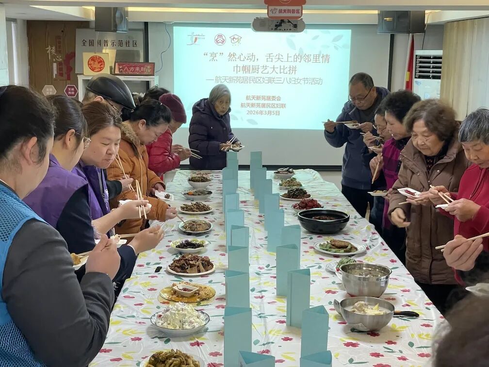 虹梅街道航天新苑居民区在“三八”国际妇女节来临之际,举办“巧手烹美味美味送亲人”巾帼厨艺大比拼,以烟火气息致敬巾帼力量,彰显社区温情与活力,成为节日里的一大亮点。活动现场,居民“大厨们”各展身手,带来精心烹制的佳肴。由街道妇联、共建单位代表、社区老人及志愿者组成的大众评审团,现场品鉴打分。最终,鸿运鲍富猪脚、本帮菜饭、腐乳肉、榴莲八宝饭、咖喱鸡、竹笋拌马兰头等六道菜品获评最受欢迎菜品。亮点纷呈的不仅是厨艺比拼,更有暖心慰问先行。活动前,居委会联合农商银行、工商银行等共建单位,上门为社区孤老、高龄独居老人及高龄妇女送上爱心馄饨和手作爱心餐,志愿者与老人亲切交谈、关心起居,传递温暖。