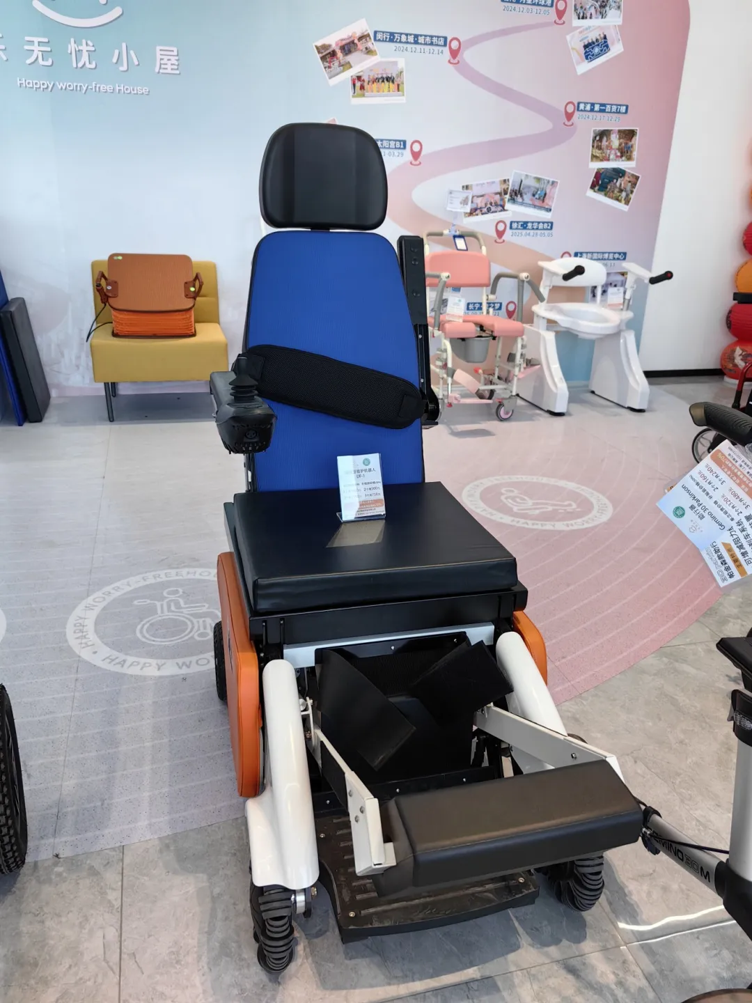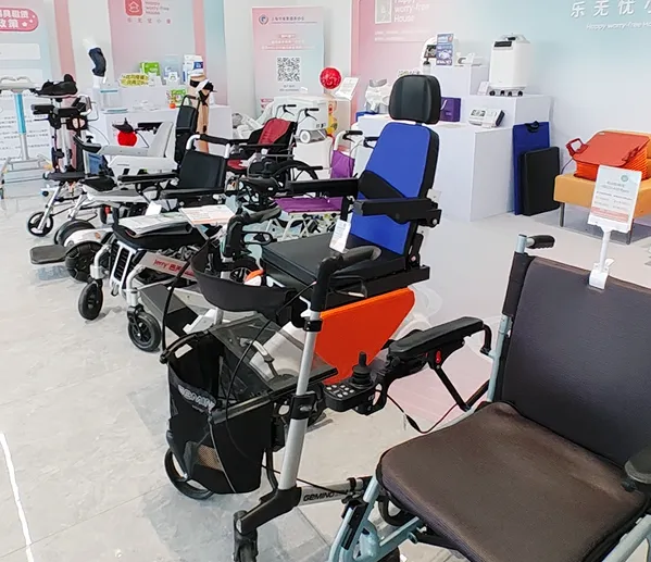 各类适老好物整齐陈列,涵盖生活起居、健康护理、出行辅助等多个品类。大厅日用品区域:服饰、防滑健步鞋、可伸缩折叠的拐杖、假发、乐器等小物件设计精巧,颜值与实用性双在线;乐无忧小屋区域集聚品类丰富的专业助老设备:电动轮椅车、浴厕用椅、康复辅助设备、小型医用制氧机等;护理床区域,多款适老化床铺开启爸妈的精致生活,电动C位椅遥控器操作简单,面板上大字体设计,细节满满。适老化空间改造区域,则集聚各大品牌卫浴、灯具、入户区改造等产品。