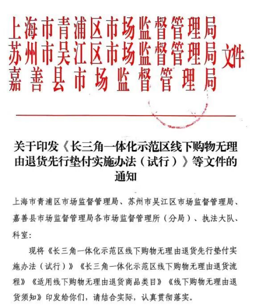 自2022年以来,青浦区、吴江区、嘉善县三地市场监管部门联合建立示范区线下无理由退货机制,出台《长三角一体化示范区线下购物无理由退货先行垫付实施办法(试行)》等文件,明确退货流程、服务规范等,并陆续发布五批跨区域无理由退货适用商家名录。