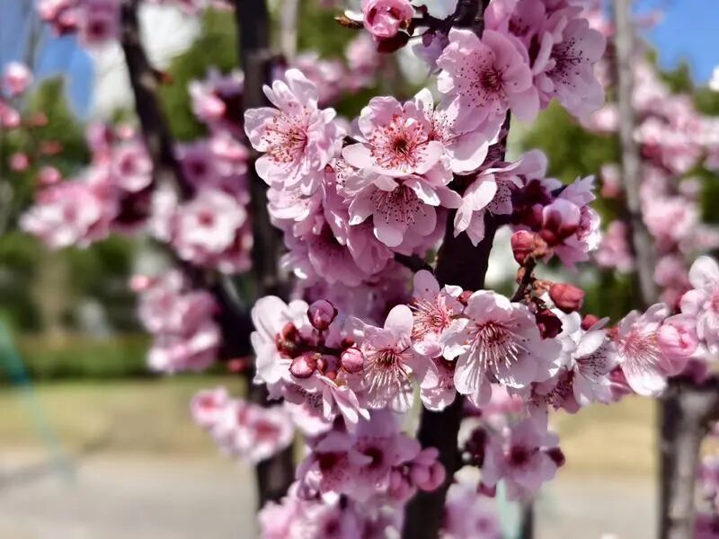 下午2点多钟,铁山路上的车流和行人相对稀少,但粉嫩粉嫩的美人梅却让一个个路人“大饱眼福”。