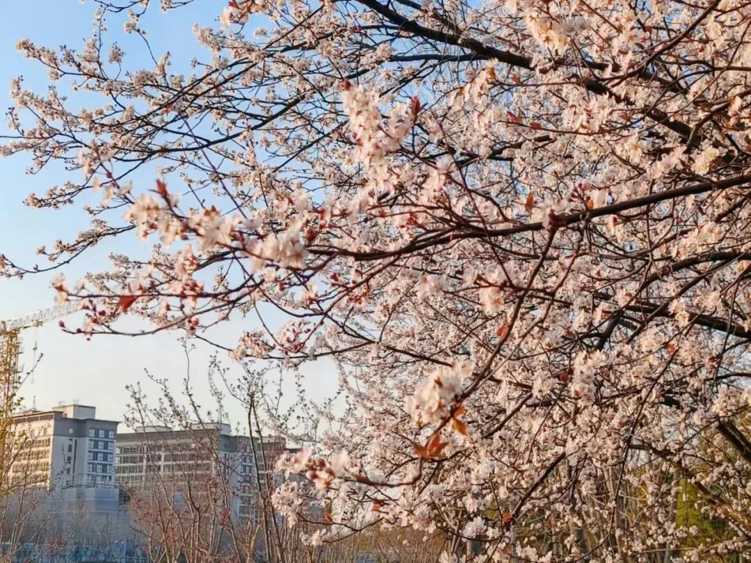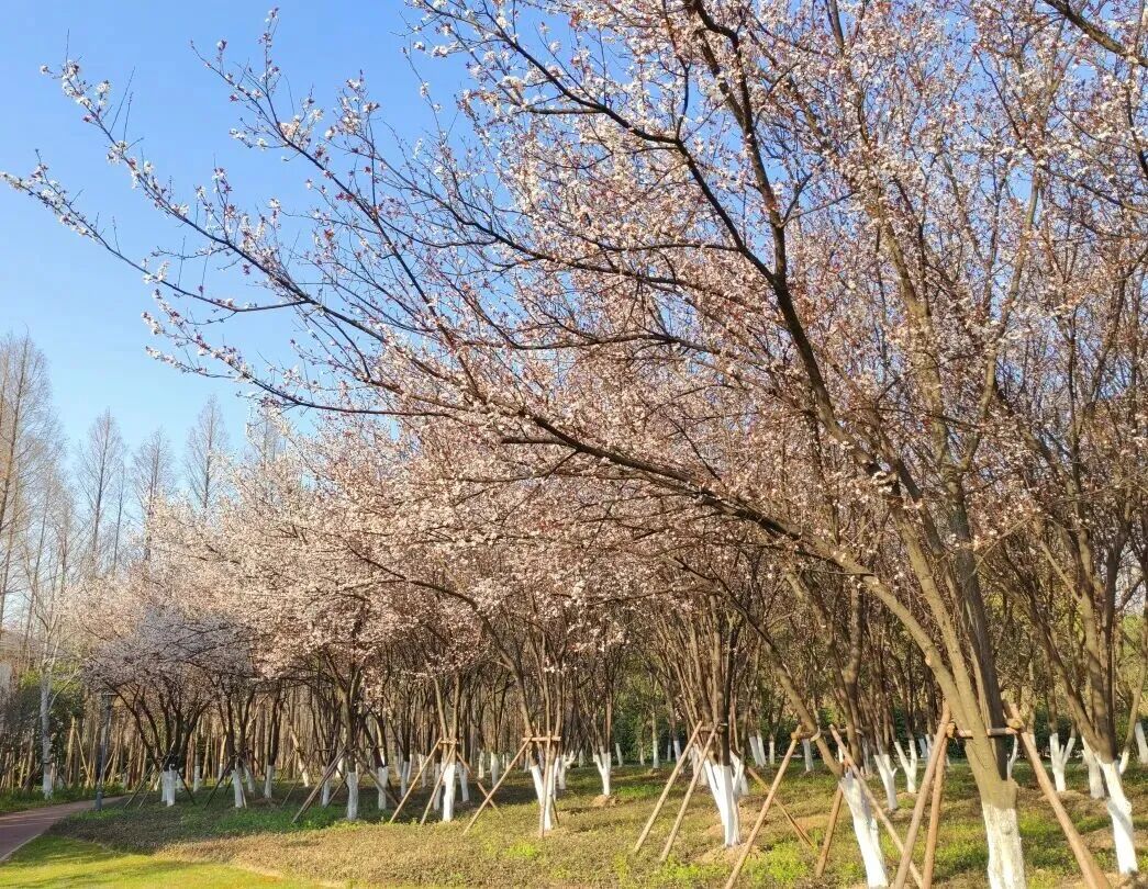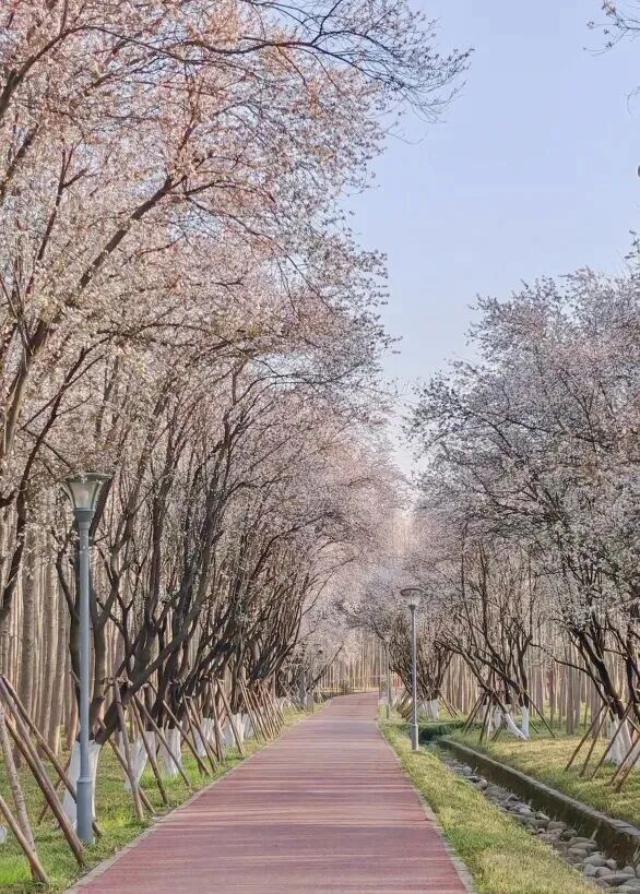 道路两侧,紫叶李与银杏交替排列,春日里,紫叶李为争抢阳光,纷纷向道路内侧舒展花枝。待到盛花期,簇簇粉白小花缀满枝头,从远处眺望,如同一条轻柔的粉色云霞铺陈在绿道上。微风拂过,花瓣轻扬,落英缤纷的唯美画面将如约而至。