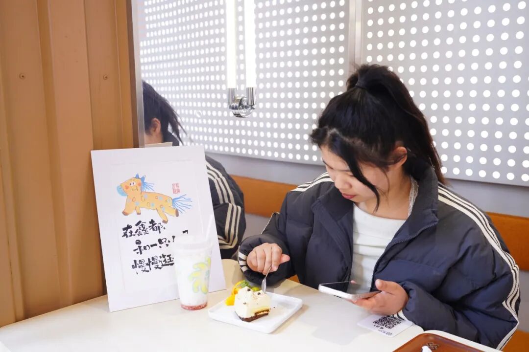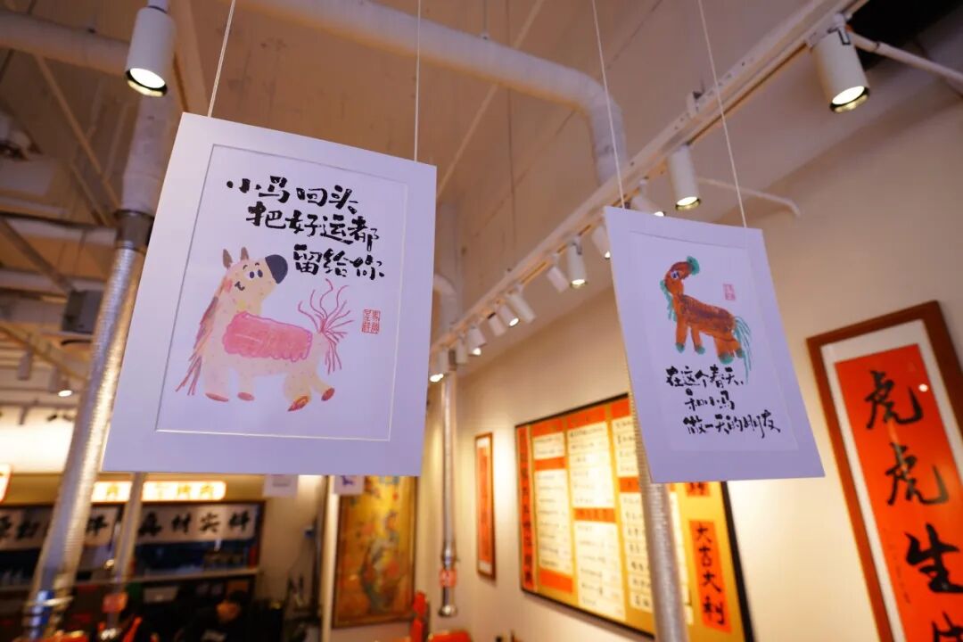 除了聚XIN咖啡,广场上多家商户也布置了小马艺术装置。祈福茶庄的小马安静沉稳;斐伦酒店的小马仿佛在门口静静等待客人归来;虎妞家齐齐哈尔烤肉店的小马悬挂店内,融入热闹烟火气;悸动糖水铺的小马化身“偷吃甜食”的趣味模样;新怡本帮面的小马从桌边悄悄探出脑袋;PoloWalk橱窗里的小马则陪你一起挑春装。