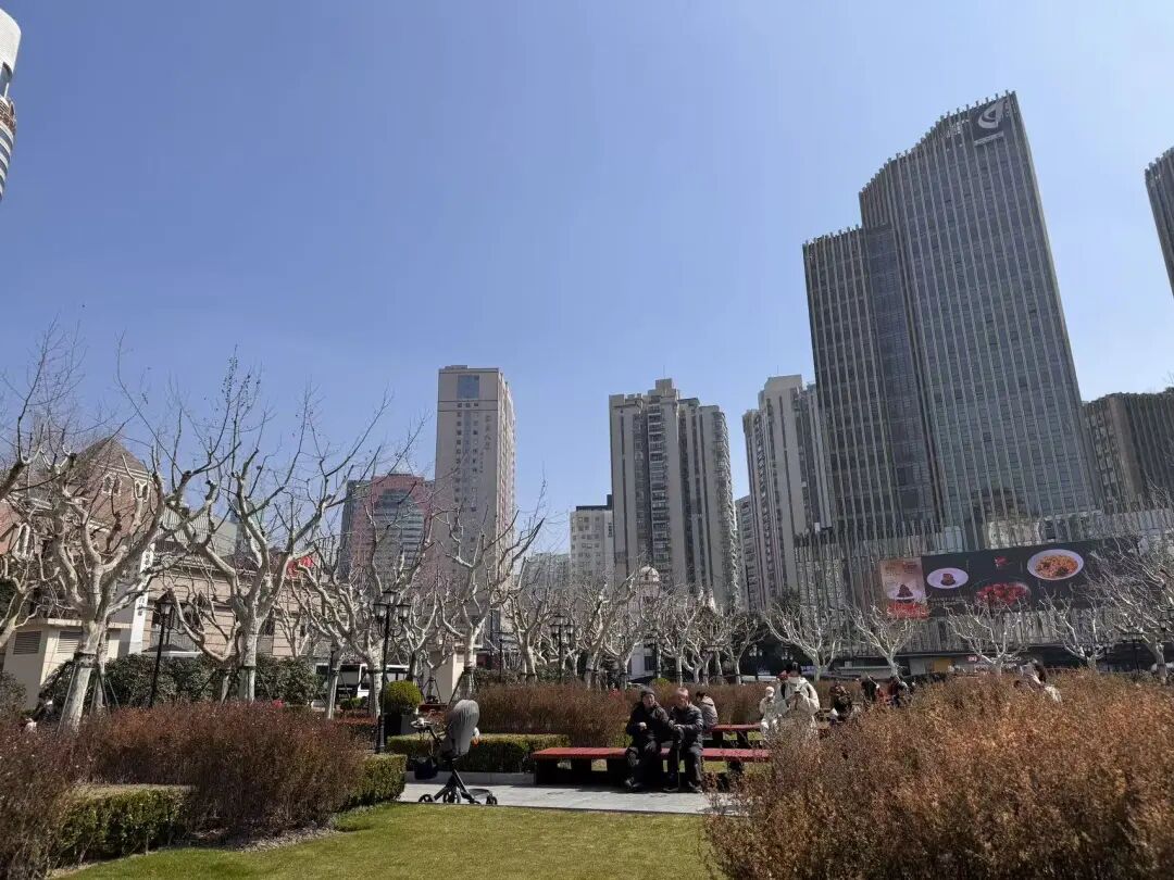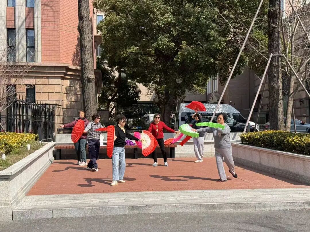 徐家汇书院广场的长椅上,老人们三两成群晒着太阳闲聊,惬意又放松;步道上,行人步履轻快,沐浴着暖阳散步、遛娃,享受这份晴好;街角的空地上,阿姨们手持彩扇翩翩起舞,红与绿的扇面在阳光下翻飞,活力满满,成为街头最生动的风景。
