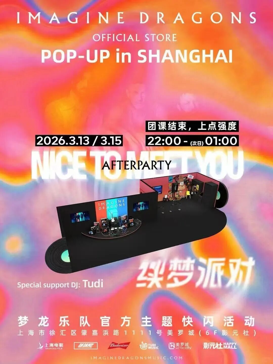 3月13日和15日梦龙乐队演唱会结束后,美罗城6F影元社HAPPYMALL还将举行两场AFTERPARTY(续梦派对),作为梦龙乐队主题快闪活动,派对会一直持续至次日凌晨1点。主办方特邀DJ助兴,让乐迷们尽情享受同好交流的快乐。届时,乐迷们可凭梦龙乐队演唱会票根或者梦龙乐队快闪店消费小票免费入场。“我们在美罗城打造的这座官方主题快闪店,是献给梦龙乐迷的‘氛围乐园’,是一个可以让热爱在演出前后持续发酵的场域。”上海电影股份有限公司工作人员介绍说。
