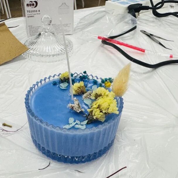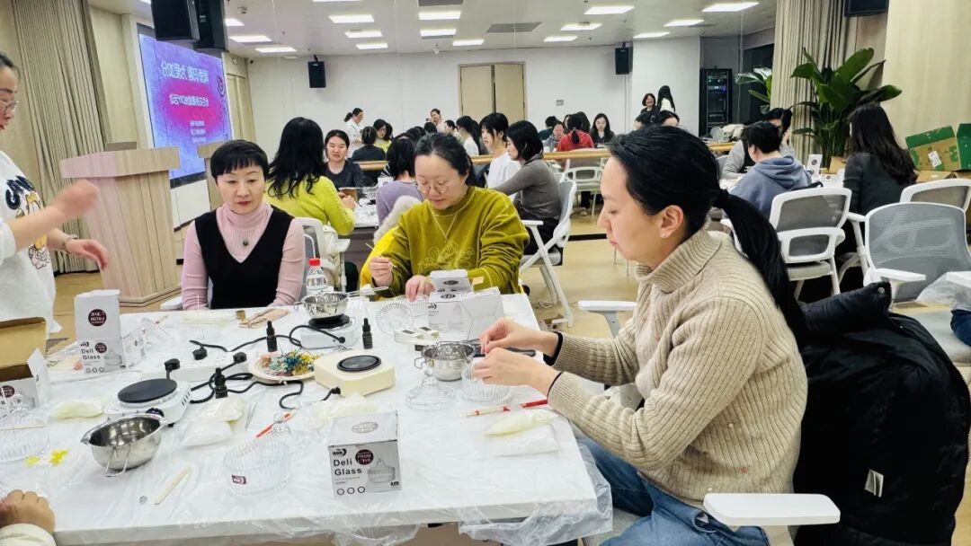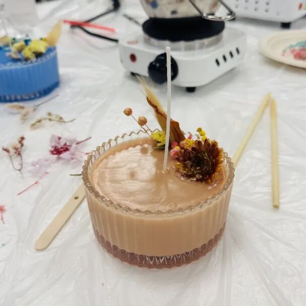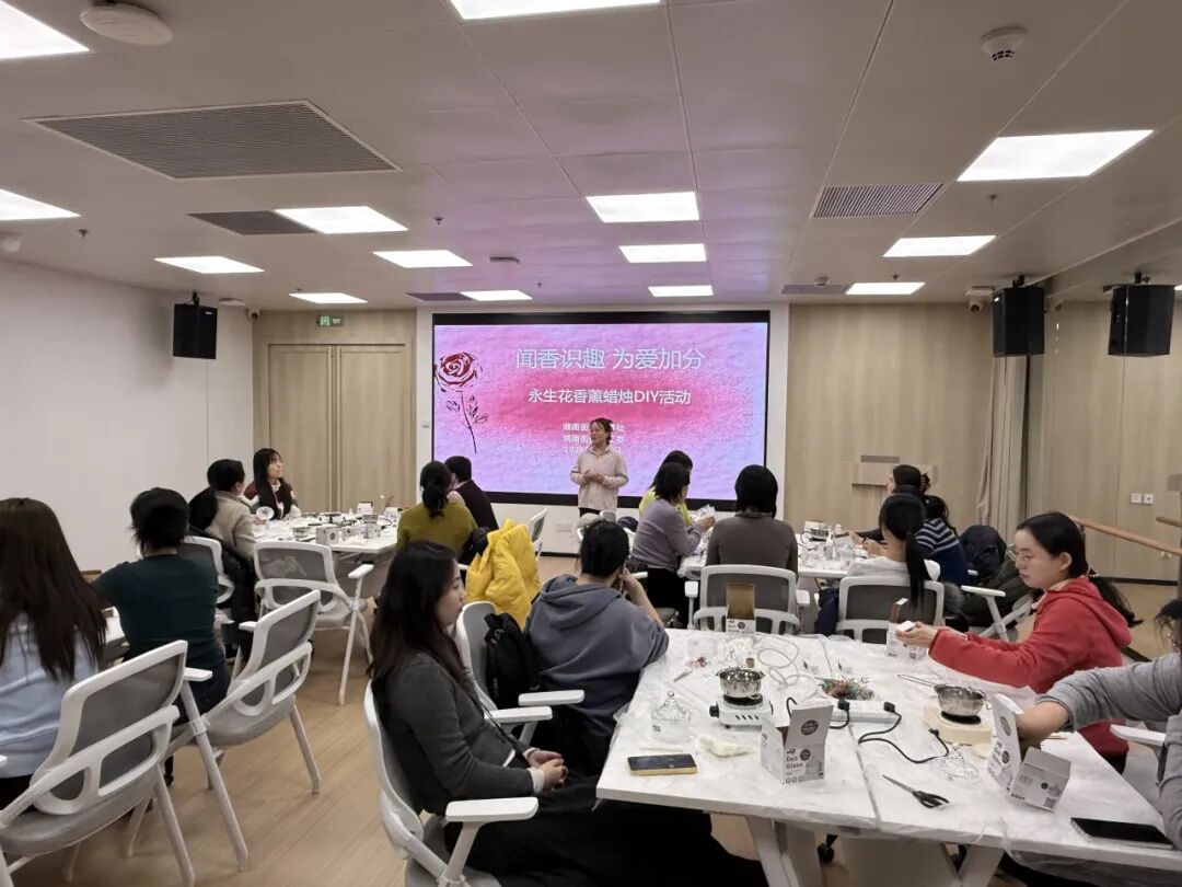 活动现场,工作人员提前备好了大豆蜡、烛芯、精油、永生花材等工具材料。在老师的细致讲解与指导下,大家从融蜡、调色、调香,到固定烛芯、摆放花材、静置定型,一步步将普通原料变成独一无二的香薰蜡烛。大家一边制作专属香薰蜡烛,一边分享工作与生活中的趣事与感悟,原本陌生的邻里同事,在花香与烛影中拉近了距离,结下了“课友情”。