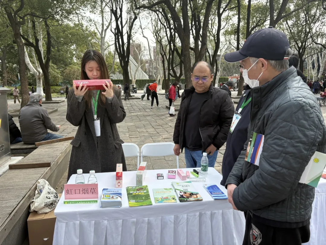 在虹口烟草摊位前,工作人员正在耐心向过往市民科普如何正确购买烟草的小知识。工作人员向记者介绍,消费者在购买香烟时,有一套简便易操作的正品核验方法。每一条正规渠道流通的香烟,均印有两行激光配送码,消费者可将第二行编码四位英文字母后的数字,与该零售店铺所持有的烟草专卖零售许可证号进行对比,若编码信息不匹配,则该香烟存在一定风险。
