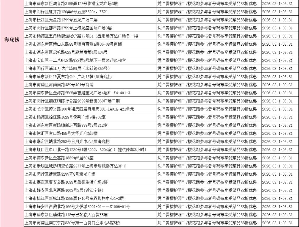 樱花节期间,持赏樱护照联动宝山核心商圈及樱花地铁七号线沿线多家核心商业综合体,例如龙湖天街、大华虎城、宝山日月光、宝山万达广场、海上世界等,多个品牌参与提供消费折扣权益。