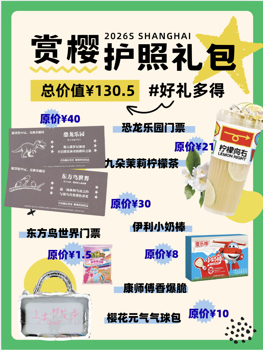 一本护照,解锁总价值130.5元的春日惊喜。从入园门票到乐园畅玩,从清爽茶饮到元气小食,你的赏樱之旅,我们早已安排妥当