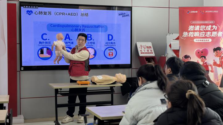 活动中,王彦杰导师以生动通俗的讲解,围绕心肺复苏(CPR)的核心步骤与实操技巧、自动体外除颤器(AED)的正确使用与注意事项,以及气道异物梗阻的紧急处理方法等内容展开教学,通过由浅入深的讲解和现场即时互动,把专业的急救知识转化为易学易懂、便于掌握的实用技能。
