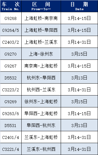 据上海铁路客户服务中心介绍,根据旅客出行需求,铁路部门增开了部分旅客列车。增开列车包括G9268(上海虹桥-南京南)、G9264/5(上海虹桥-阜阳西)等。