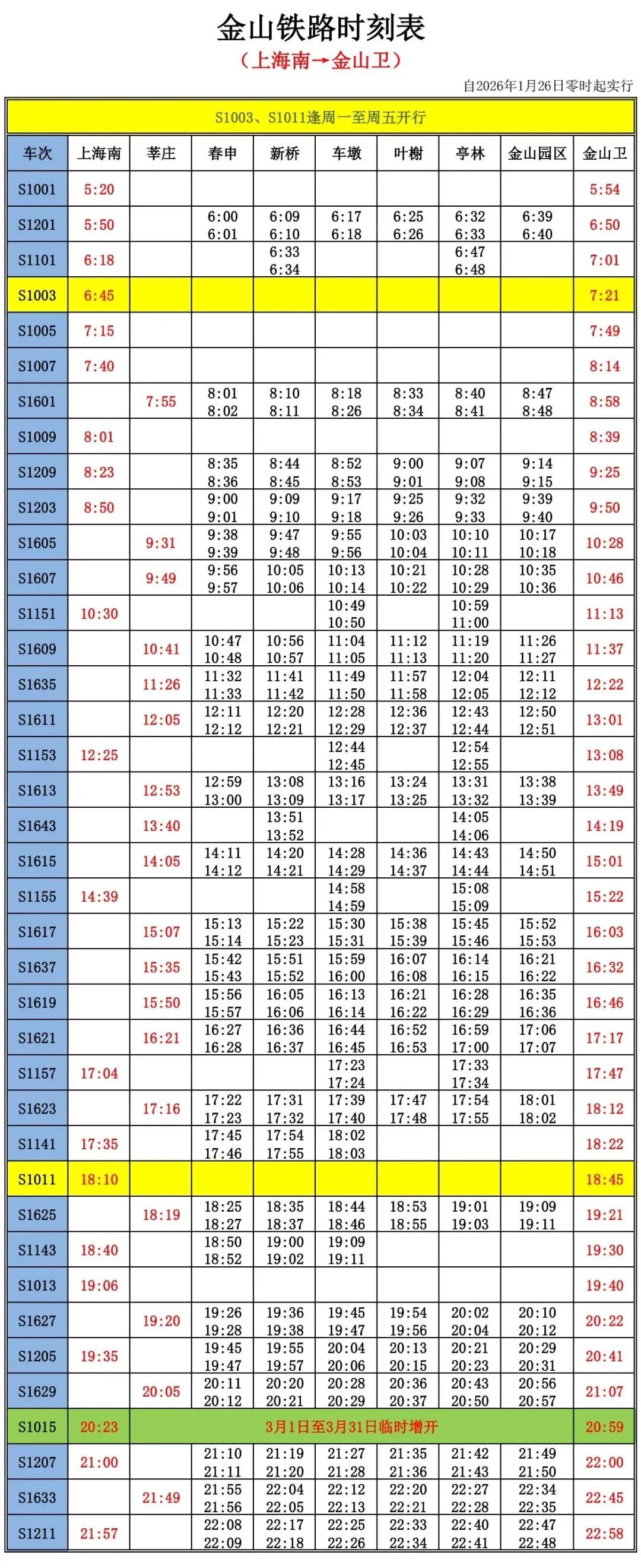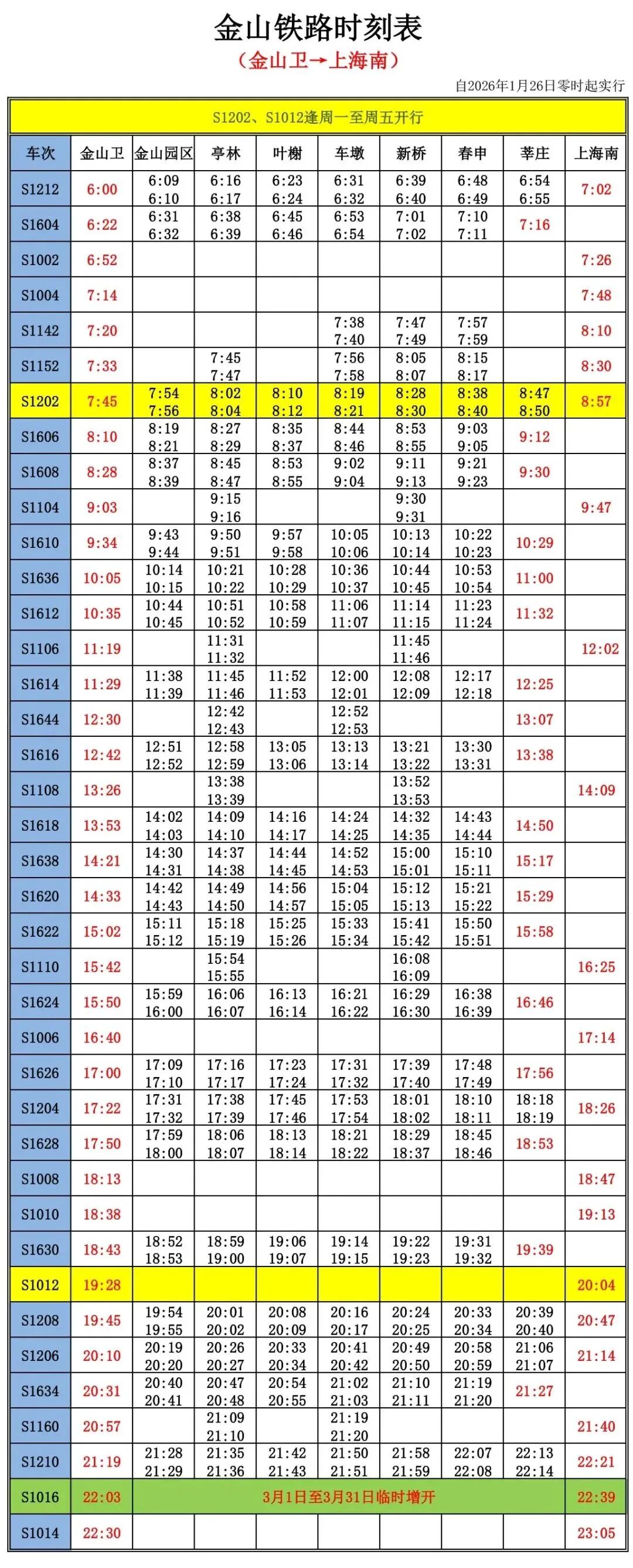 据金山铁路介绍,根据最新通知安排,2026年3月1日至3月31日,金山铁路临时增开S1015次、S1016次两趟直达列车。工作日方案与周末方案均为同一图,区别在于图中黄色标注的车次(S1003次、S1011次、S1202次、S1012次)周末不运行,其余车次不变。