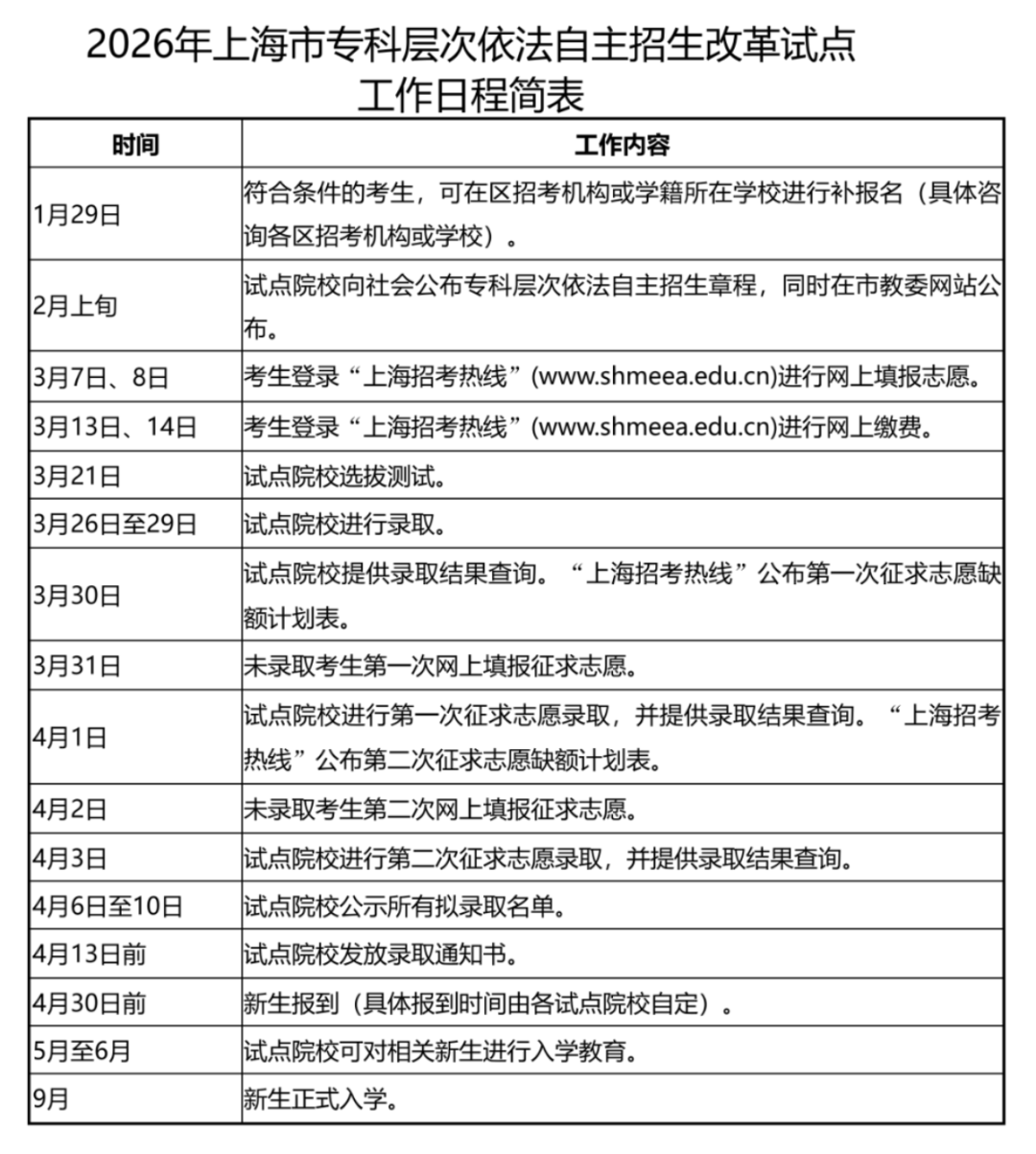《2026年上海市部分普通高校专科层次实行依法自主招生改革试点方案》公布,《方案》显示,2026年专科自招共有36所试点院校参加,各项测试统一定于3月21日(星期六)8:30开始。