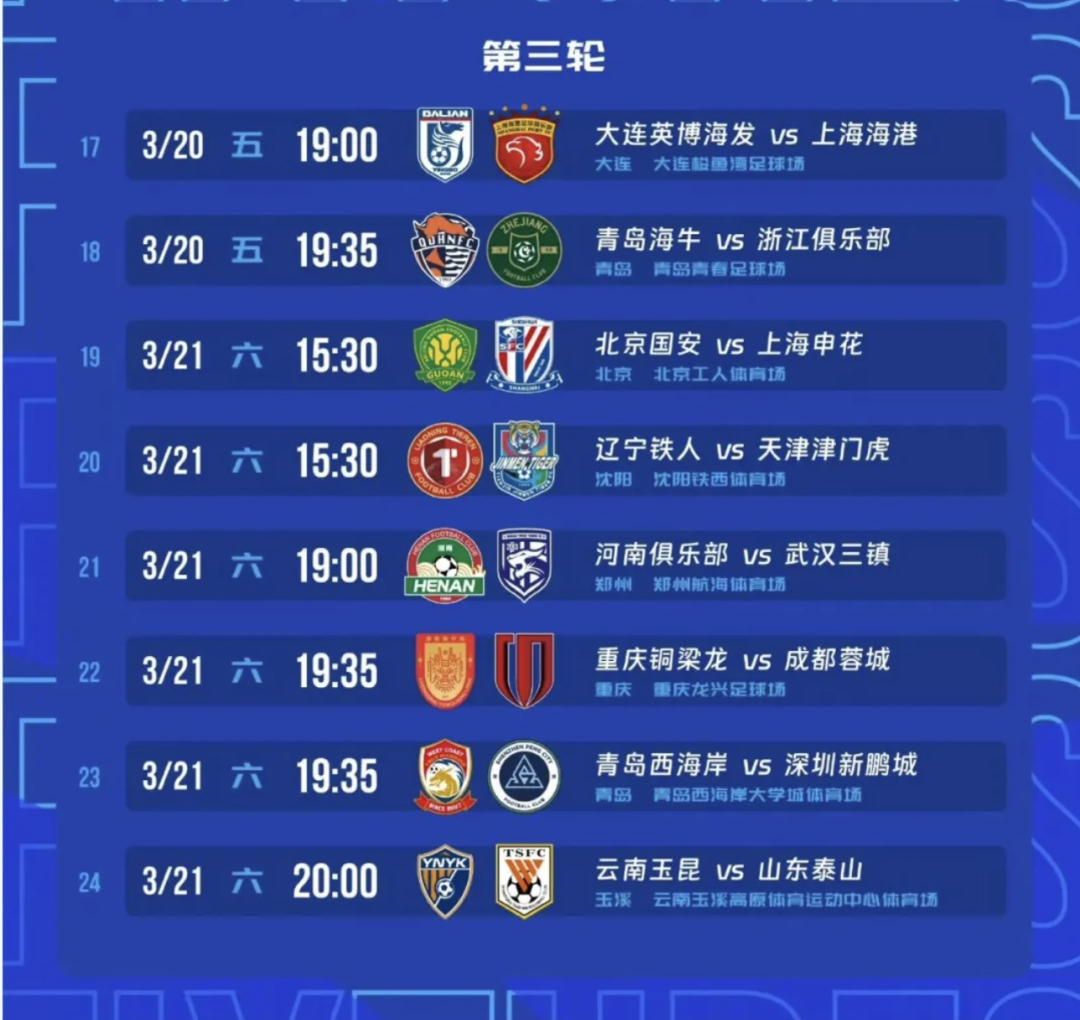 本周,中超联赛将先后进行第三轮赛事。上海两队赛程如下: