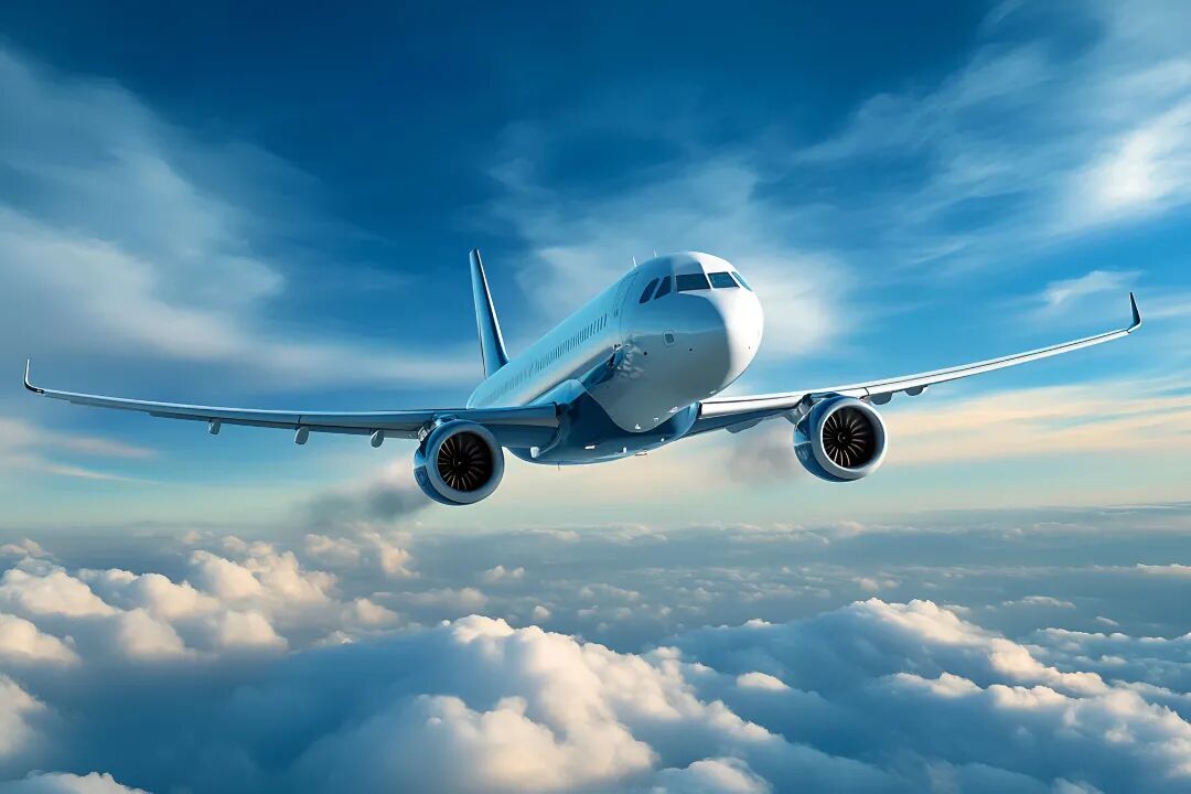 写实现代风蓝天白云背景白色双引擎飞机飞行中插画(商业使用).jpg
