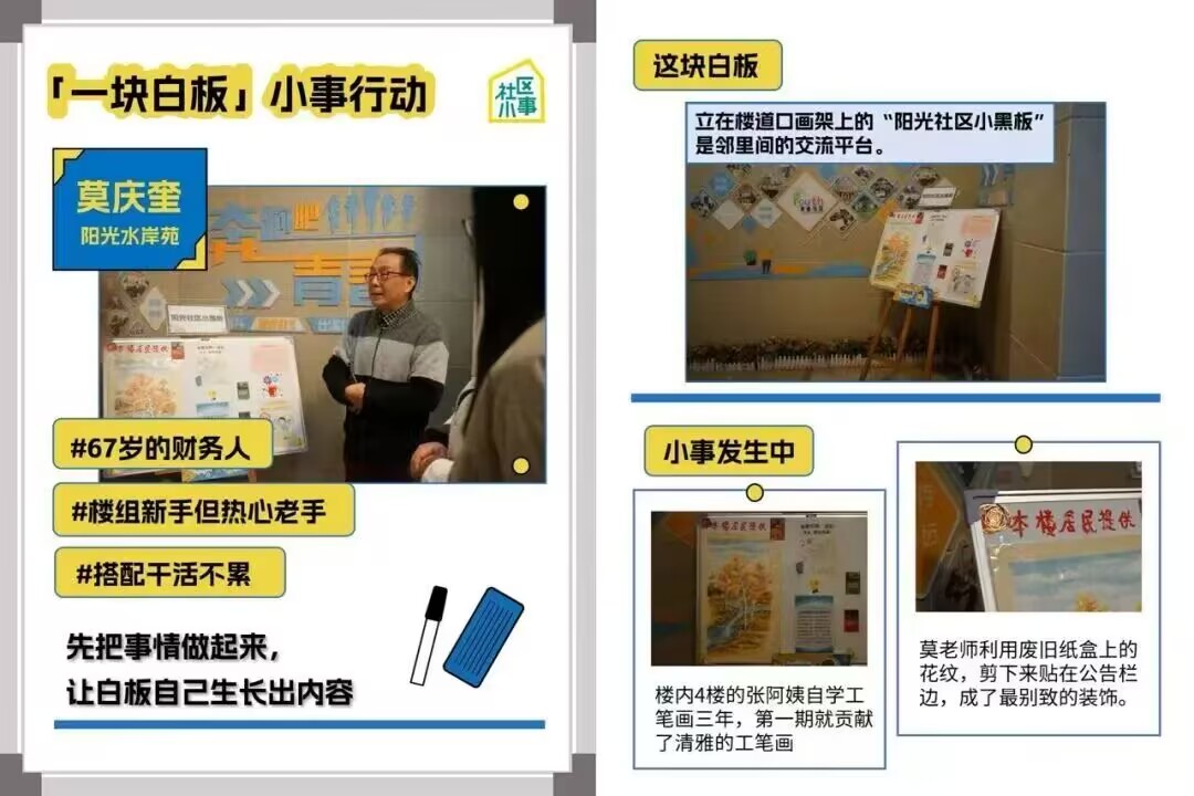 “内容不愁,就看愿不愿意留意身边。”当过会计的莫庆奎,把这方白板当成一项“长期投资”。有居民反映晚上噪音问题,他就贴个温馨提示;寒潮来了,马上贴天气预警;下一期,居民要捐酸奶机、榨汁机,他准备把信息放上去,让闲置物品流动起来。