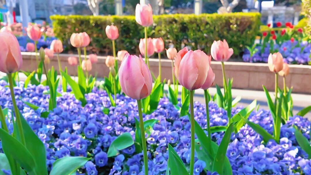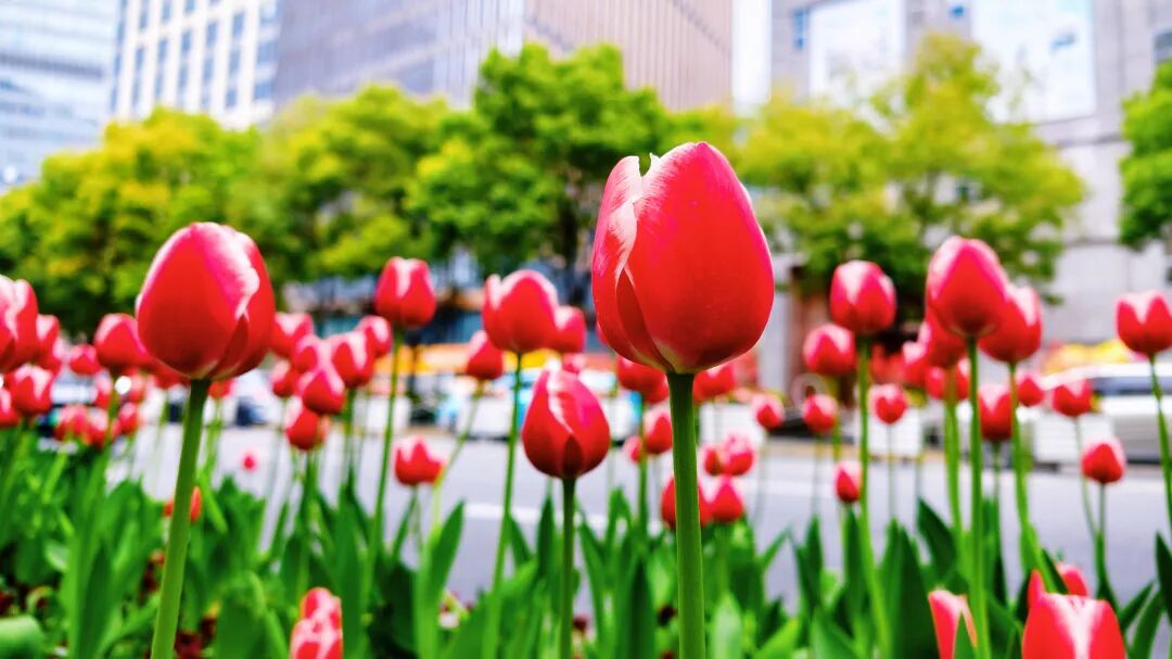 沉浸式街景赏花,郁金香成排点缀在机非隔离带中,骑行穿行其间,仿佛闯入一条流动的春日花廊,轻松又治愈。