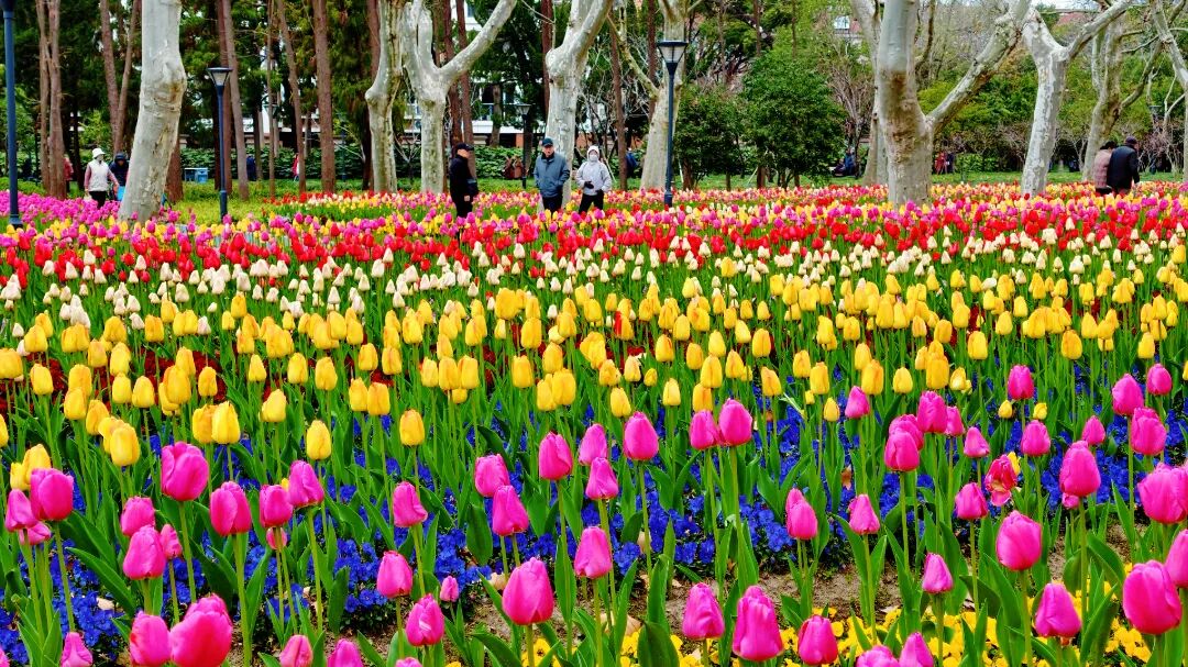 闸北公园的郁金香成片种植,粉、黄、红、白等多种颜色交织在一起,宛如一幅色彩斑斓的春日油画。花海周边绿植环绕,空气清新,让人忍不住放慢脚步,静下心来感受春日的浪漫。此外,公园内的树荫较多,即使是晴天前往,也不会觉得炎热,非常适合老人、小孩一同前往,全家沉浸式感受春日美景。