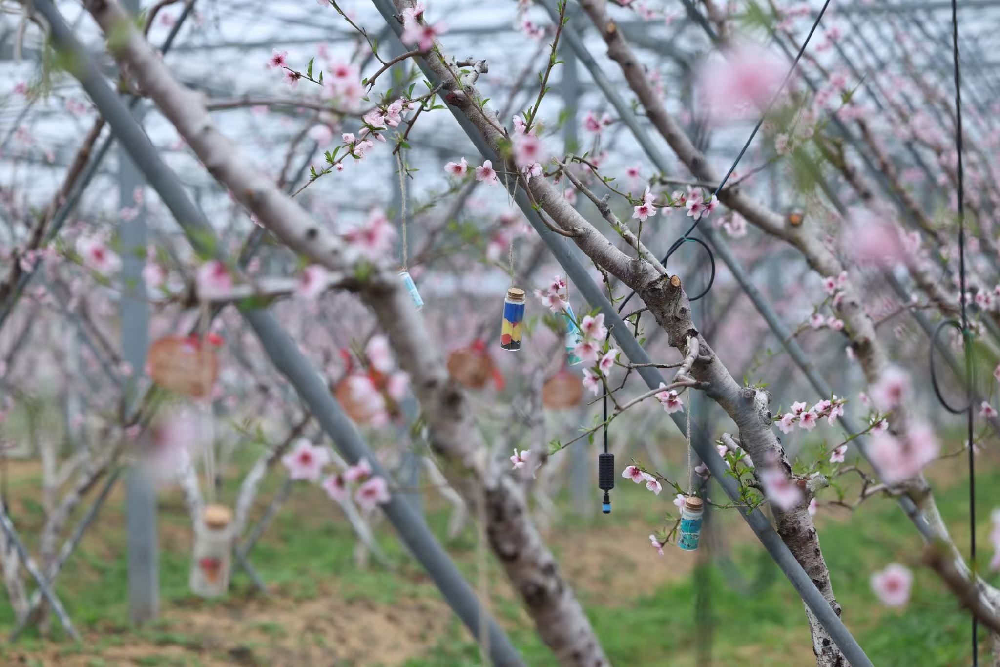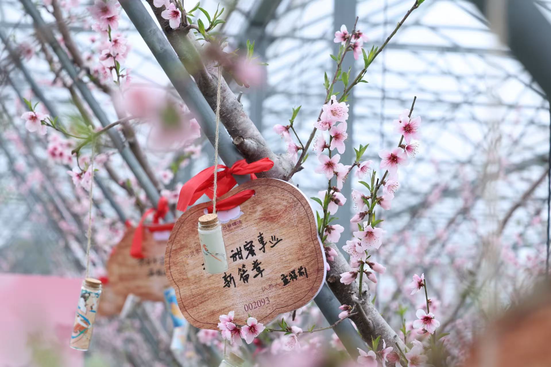 除室内展区外,还特别在室外桃林打造了创意艺术打卡点。选取了以蟠桃、仙女等为主题、寓意美好的作品进行艺术复刻与再创作,制作成许愿瓶等艺术装置,悬挂于桃树枝头,方便游客参观、打卡拍照,形式新颖别致。