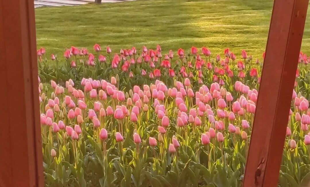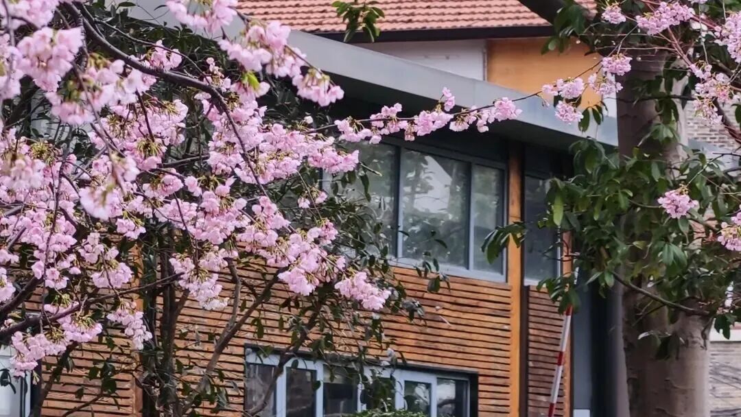 春日的阳光穿透玻璃幕墙,郁金香花海在门前铺成彩虹地毯,樱花树影婆娑,花瓣随风轻舞,像是把整个春天都装进了画框。
