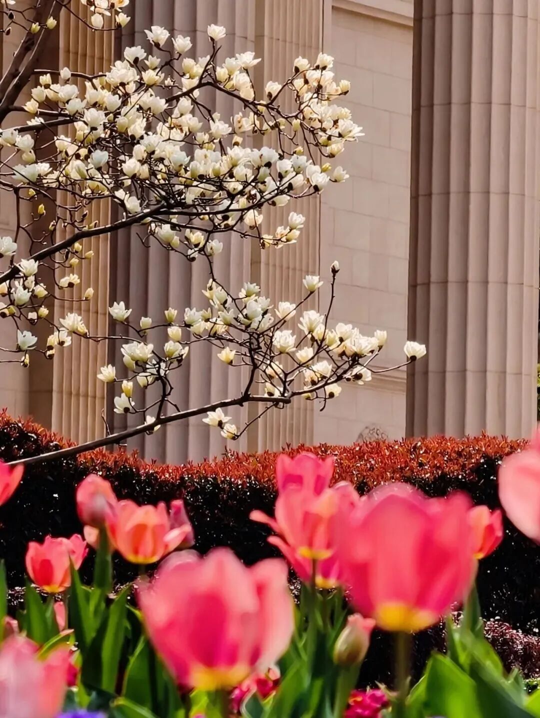 靠近自然博物馆的草坪上,开满了粉色、红色、紫色的郁金香,大片色块明艳动人,像打翻的调色盘。